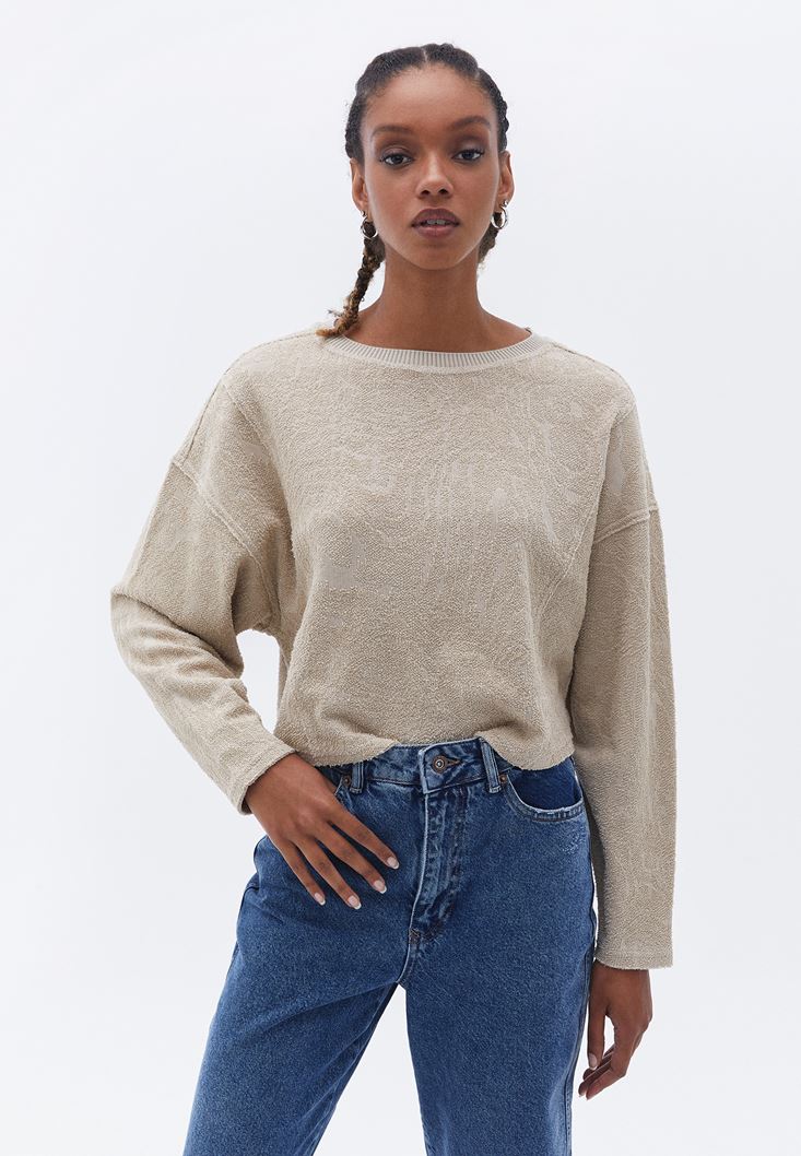 Pamuk içerikli triko, bot yaka, uzun kollu, bedenden uzak loose fit, crop kesim.