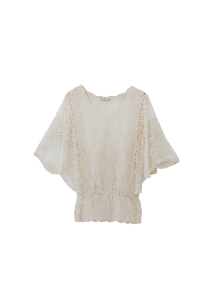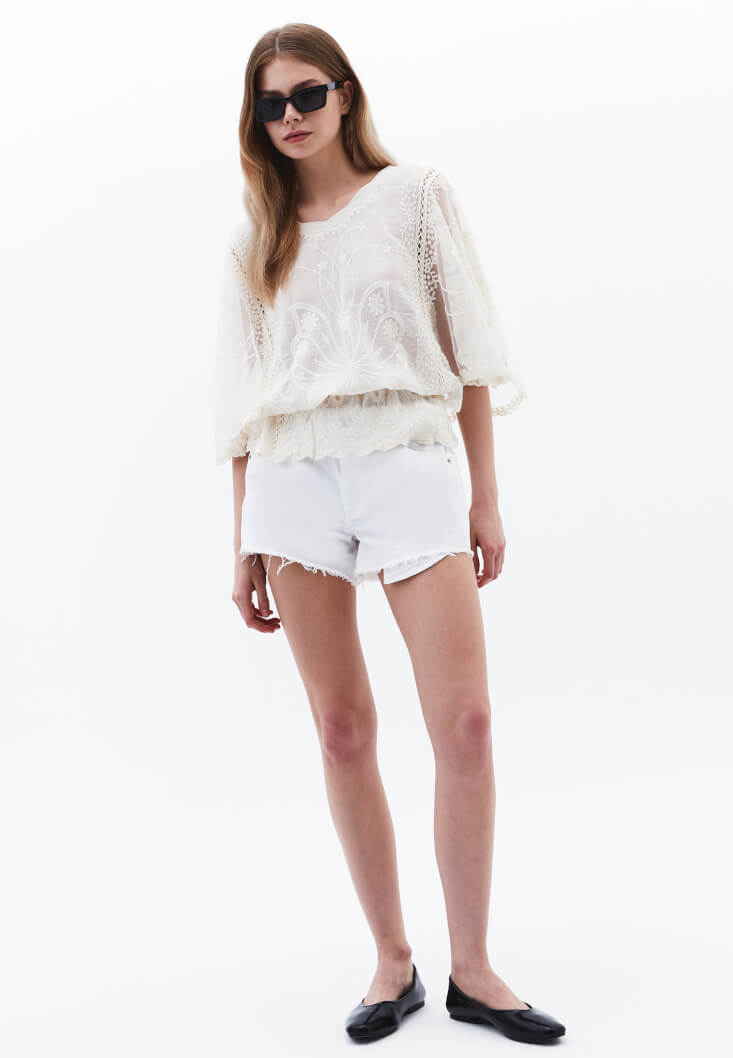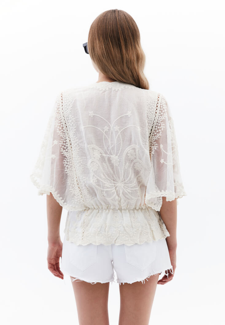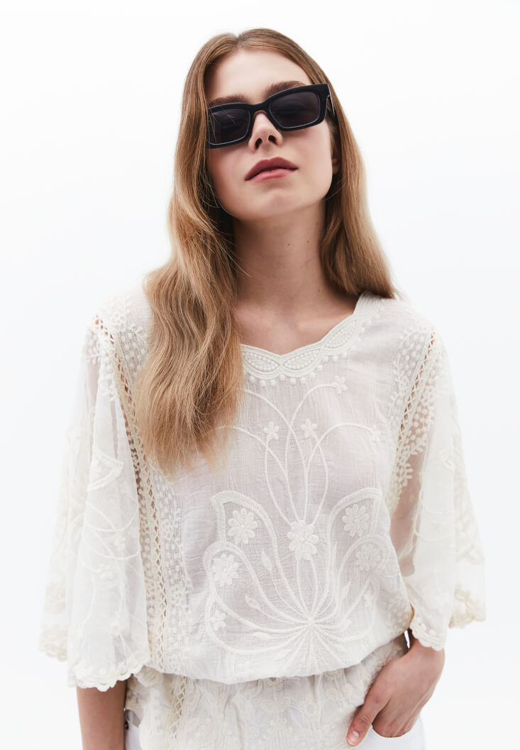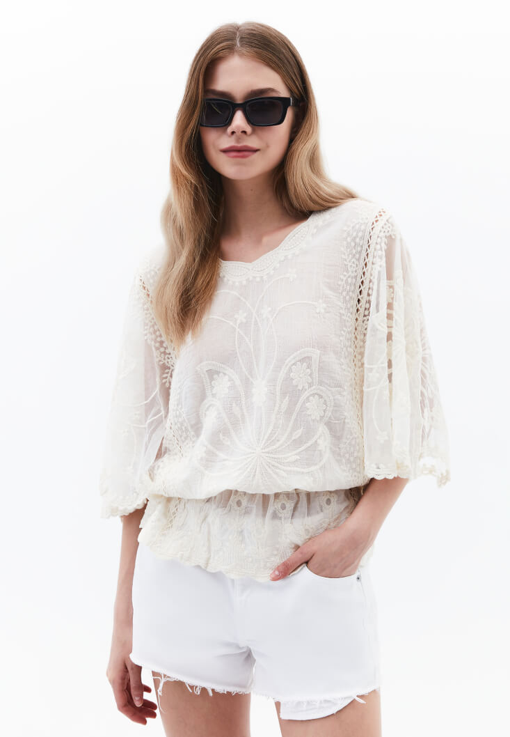 • Bayan Krem Bot Yaka Nakışlı Bluz