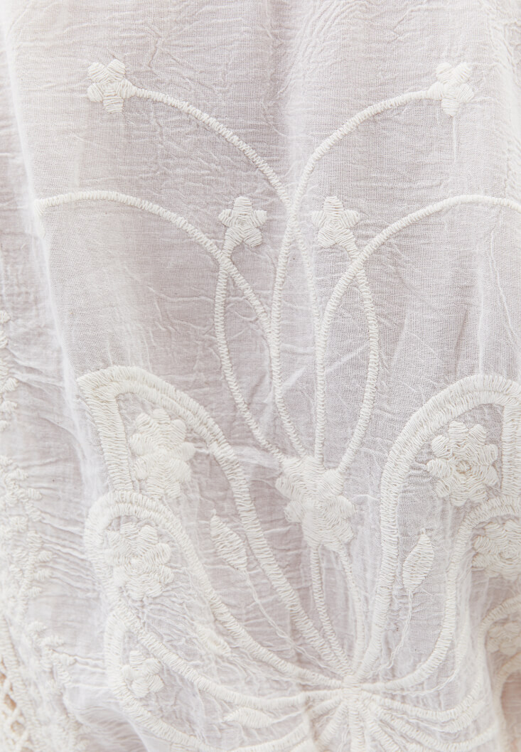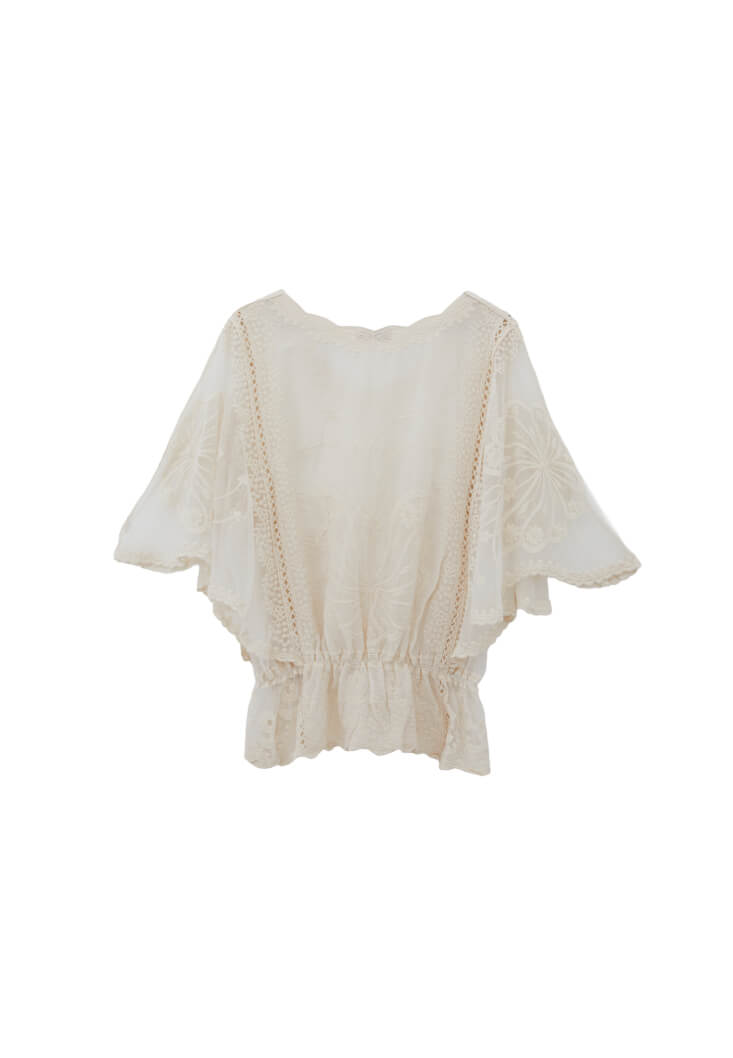 Krem Bot Yaka Nakışlı Bluz