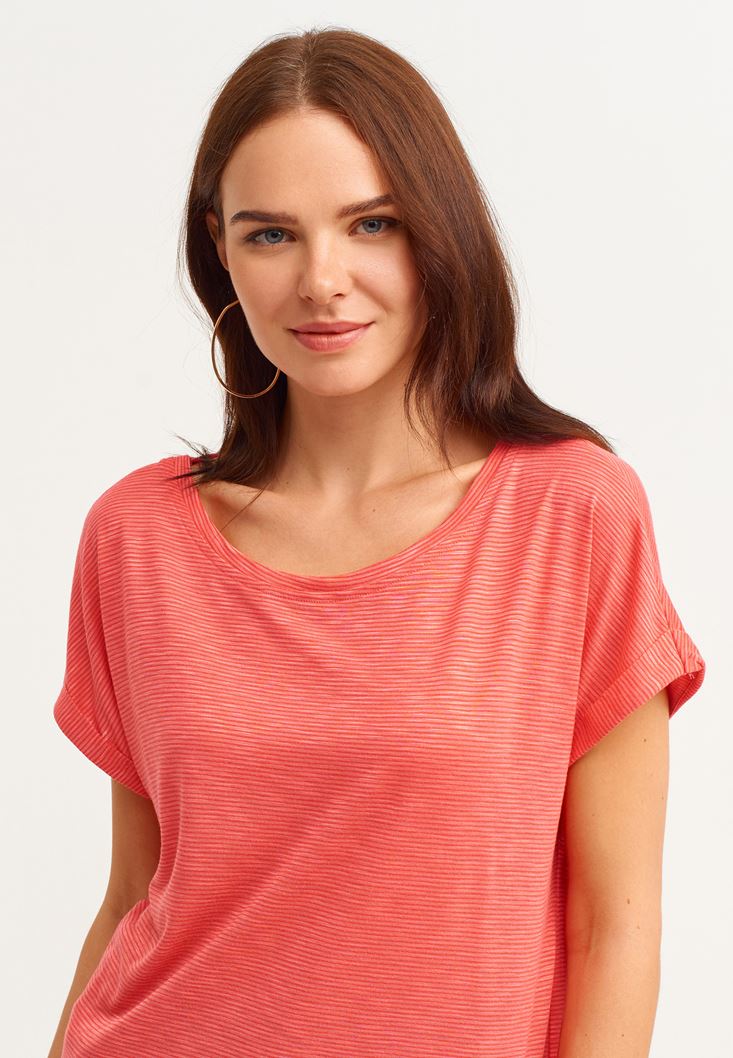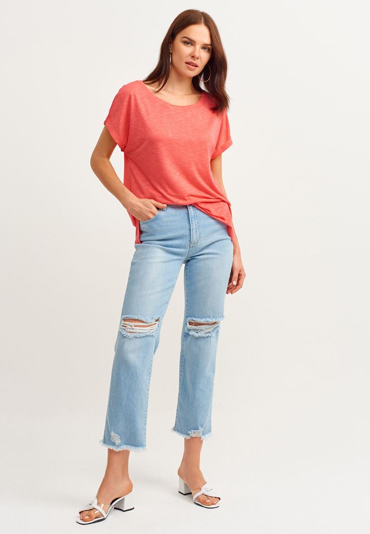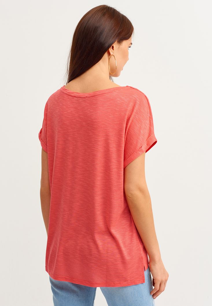Bot Yaka Tişört modeli. Aradığın yumuşaklık için ideal seçenek olan viskon içerikli bu parça şimdi karşında! Yeni sezonda seninle buluşan bot yaka tişört modelinin duble kol detayı ve çizgi görünümlü dokusu gününe hareket katsın... Mini şortların rahatlığı ile uyum yakalamak için kullanabileceğin bu tişört ile özgürlüğü kucakla!