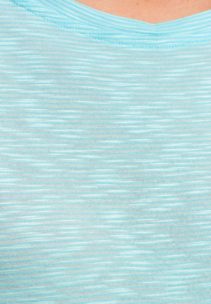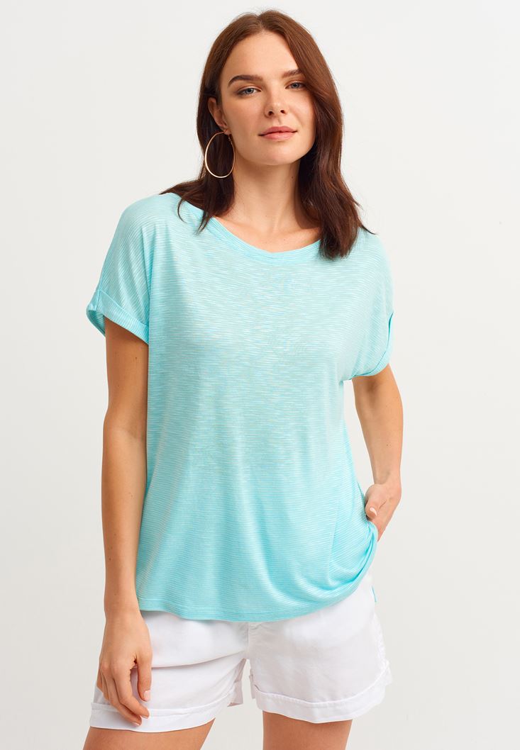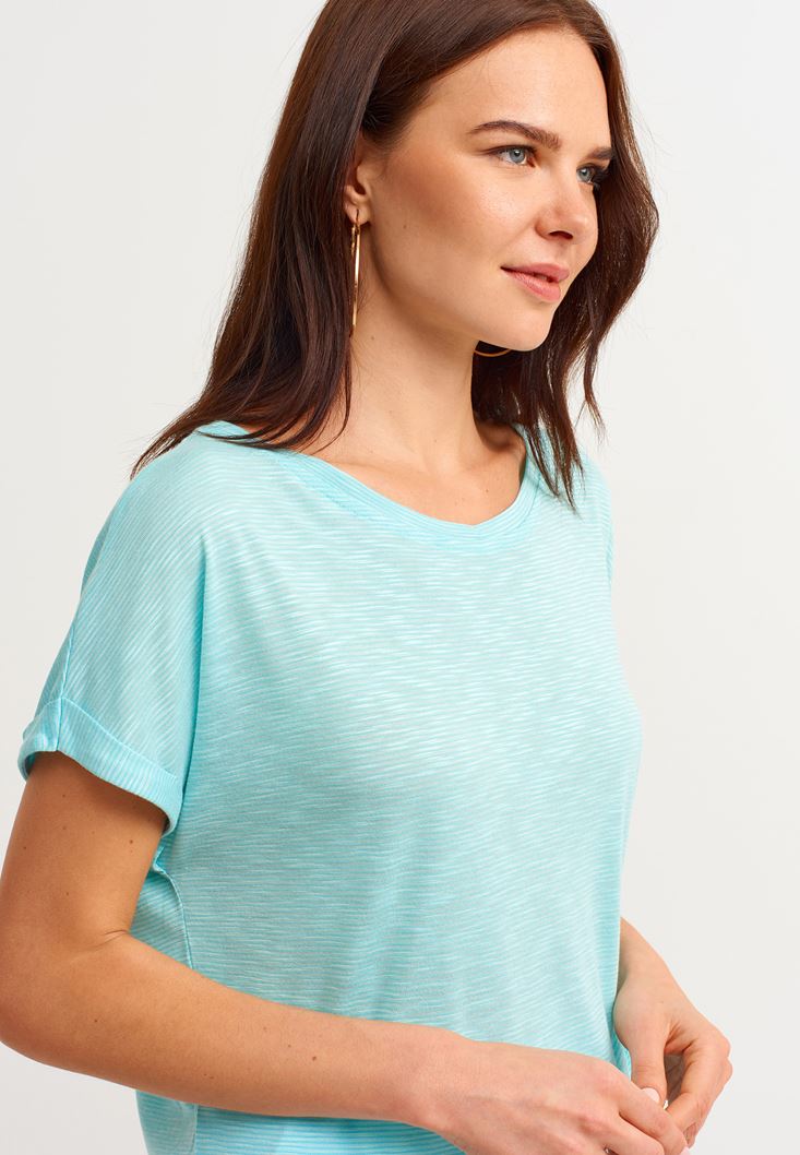 Bot Yaka Tişört modeli. Aradığın yumuşaklık için ideal seçenek olan viskon içerikli bu parça şimdi karşında! Yeni sezonda seninle buluşan bot yaka tişört modelinin duble kol detayı ve çizgi görünümlü dokusu gününe hareket katsın... Mini şortların rahatlığı ile uyum yakalamak için kullanabileceğin bu tişört ile özgürlüğü kucakla!
