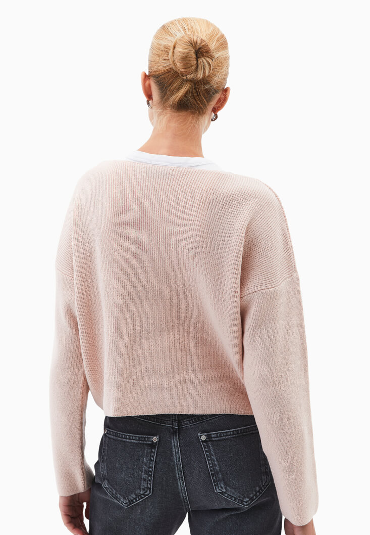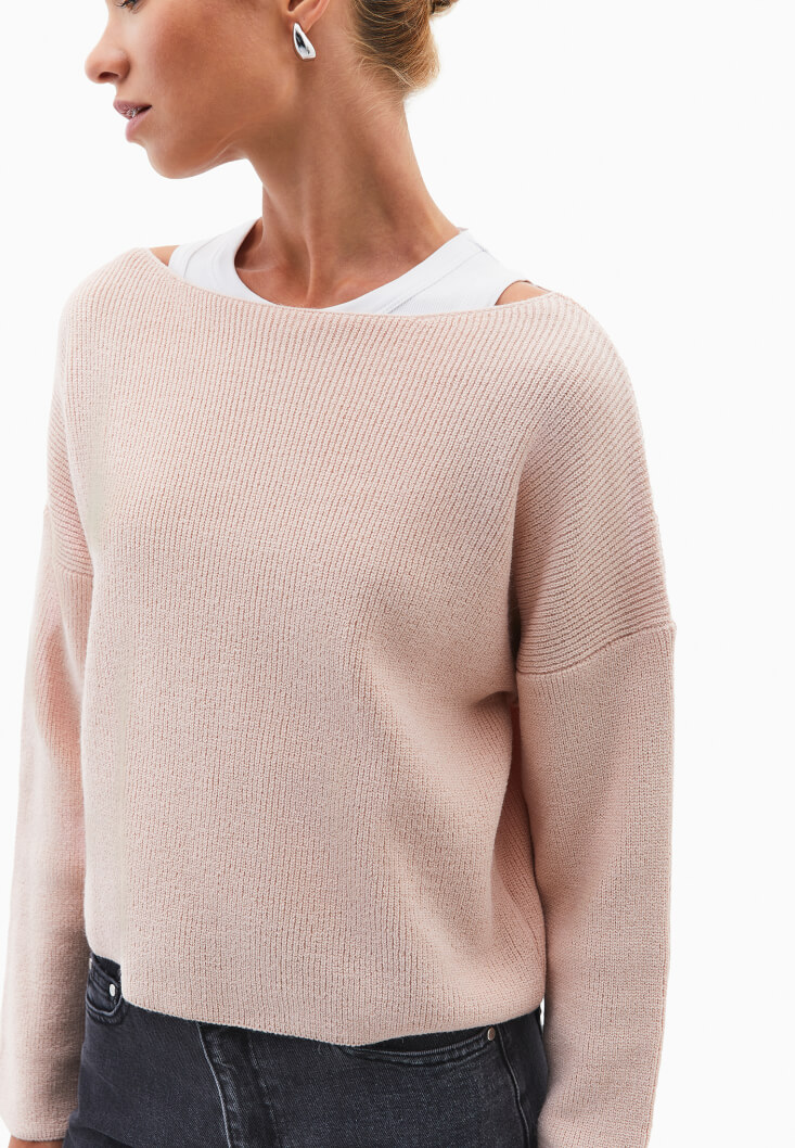 Özel triko doku, bot yaka, uzun kollu, bedenden uzak relax fit.