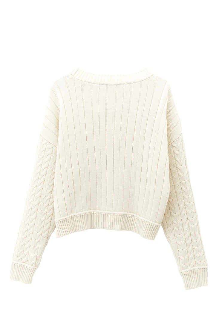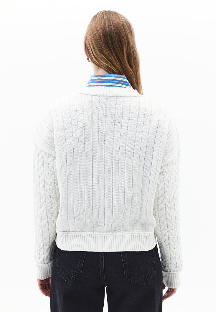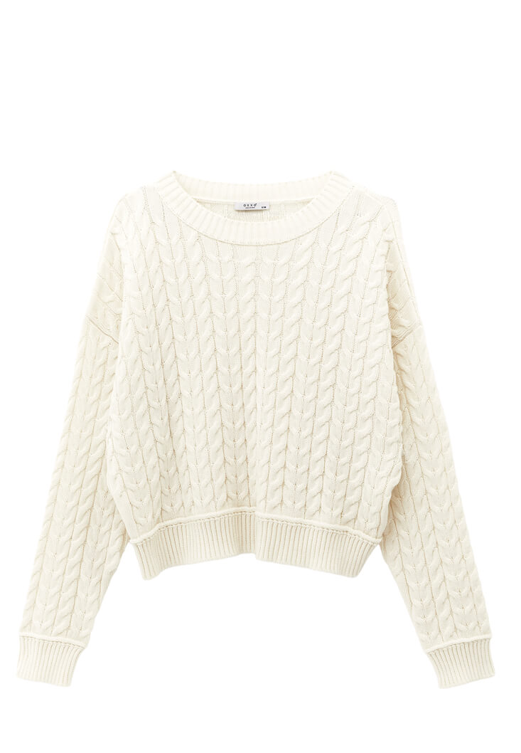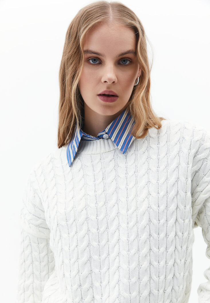 Pamuk ve akrilik karışımlı triko, saç örgüsü motifli, bot yaka, uzun kollu, crop kesim, bedenden uzak rahat fit, kol/etek ucu ve yakası jakarlı örgü.