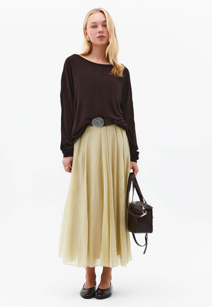 Viskon karışımlı özel doku, bedenden uzak loose fit, uzun kollu, bot yaka.