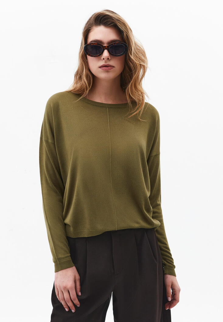 Köprücük kemiğini nazikçe ortaya çıkaran bot yaka (boat neck) tasarımı, silüetinize anında feminen bir zarafet kazandırır. Bedenden hafifçe uzak, konforlu kesimi (loose fit) sayesinde gün boyu özgürce hareket edebilir, triko örgünün sıcaklığını ve kalitesini her dokunuşta hissedebilirsiniz. Formunu uzun süre koruyan yüksek kaliteli yapısı, bu tasarımı sezonlar boyu vazgeçilmeziniz kılacak.