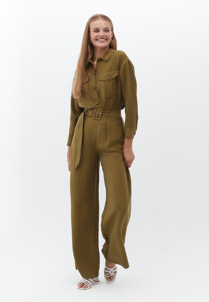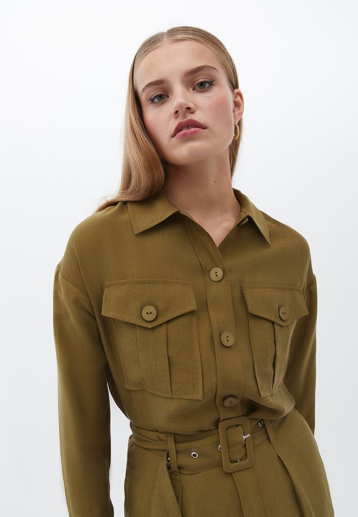 Lyocell içerikli geri dönüştürülebilir doku, düğmeli ve kapaklı iki cep, bedenden uzak boyfriend fit, düğme kapamalı, sırt kısmı pile detaylı.