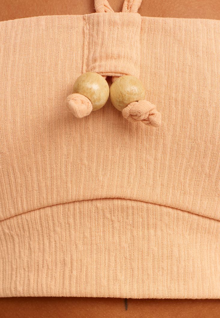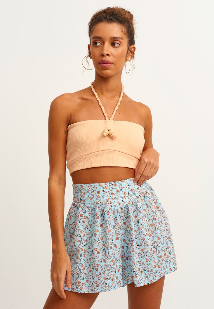Pamuk karışımlı özel doku, bedeni saran close-fit, straplez form, boyundan bağlama detaylı ve boncuk ayrıntılı bağcık.