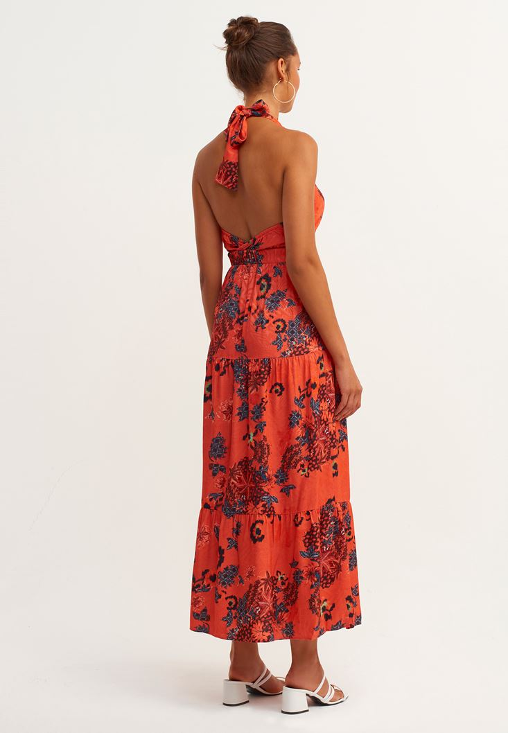 Çok Renkli Boyundan Bağlamalı Desenli Maxi Elbise