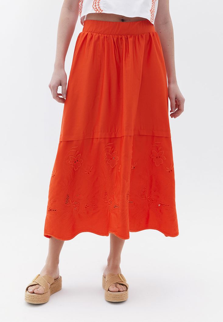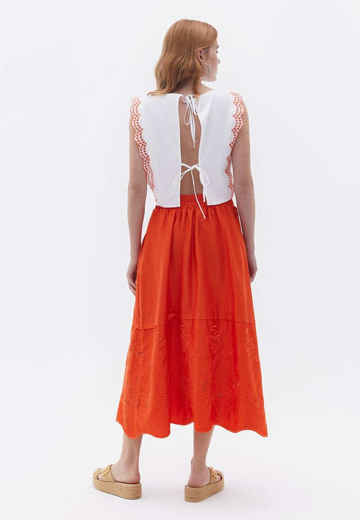 %100 pamuklu doğal doku, yüksek bel, kat detayından itibaren brodeli, arka bel kısmı lastikli, midi boy, a kesim.
