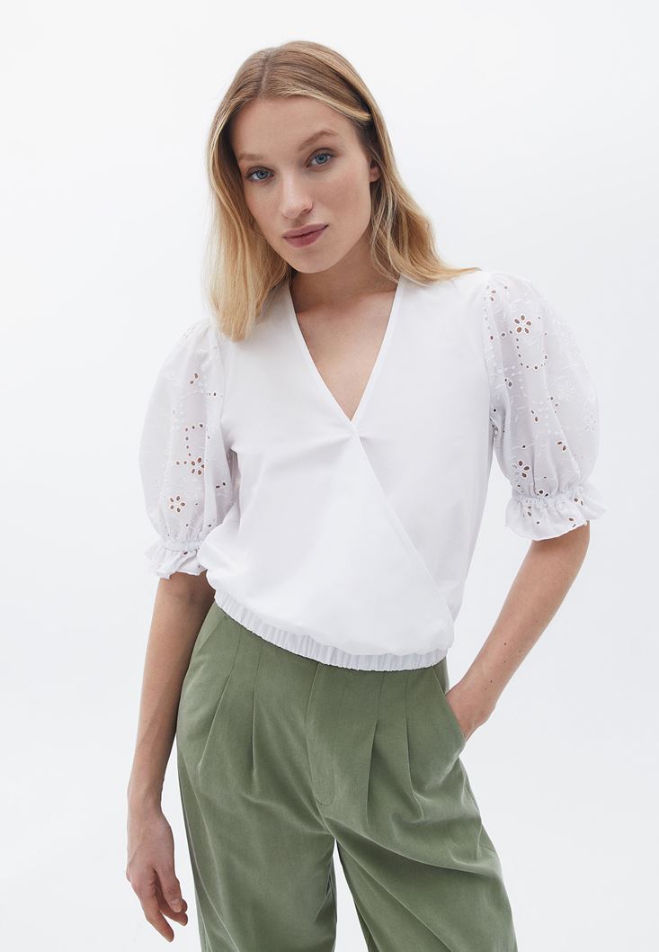 Pamuk karışımlı doku, bedene yakın fit, yarım kollu, kruvaze yaka, beli ve kol ucu lastikli, kol kısmı brodeli.