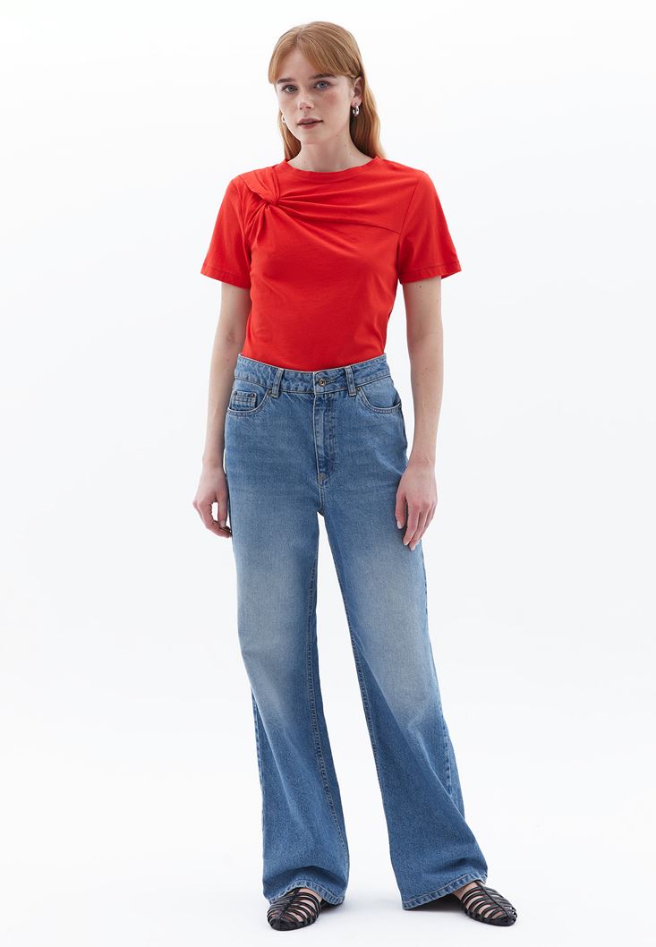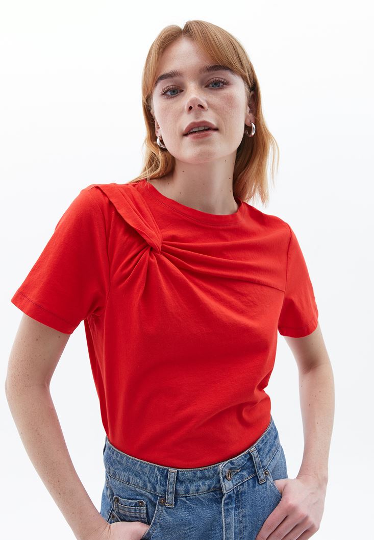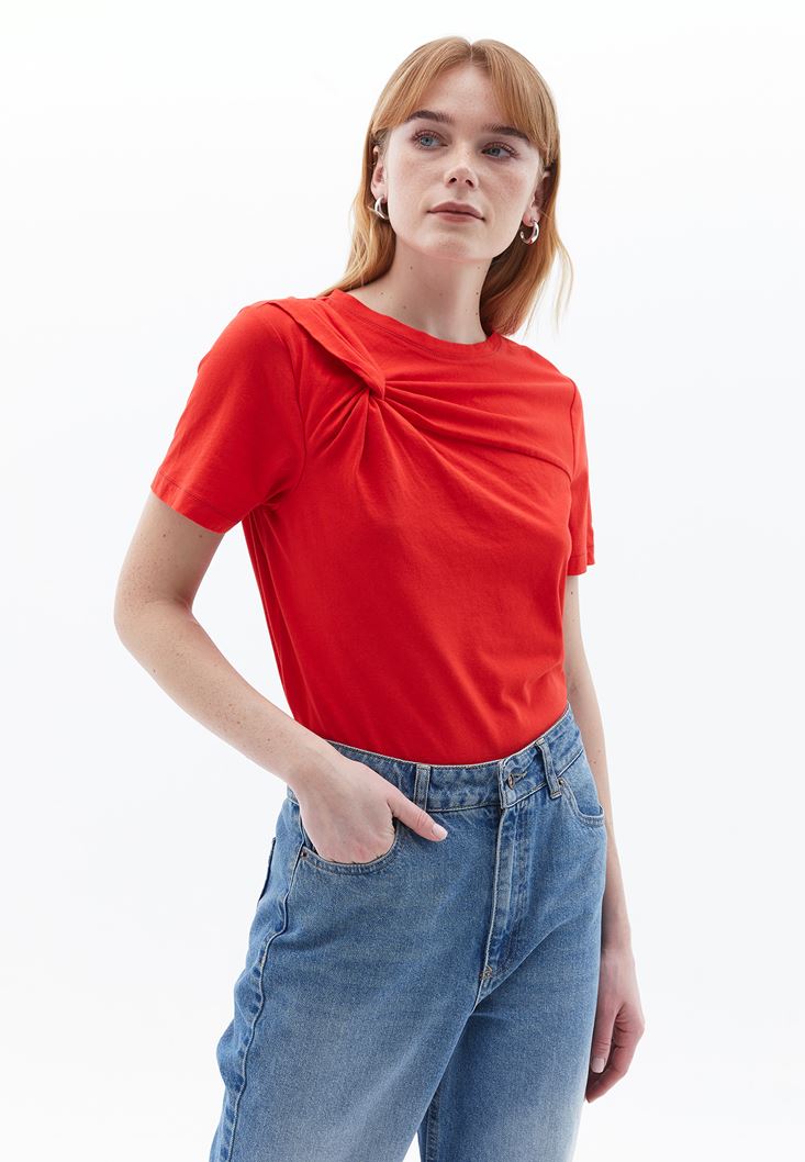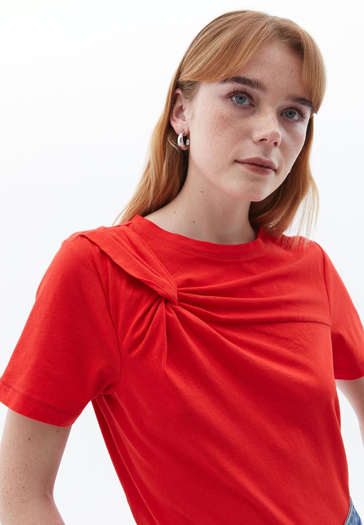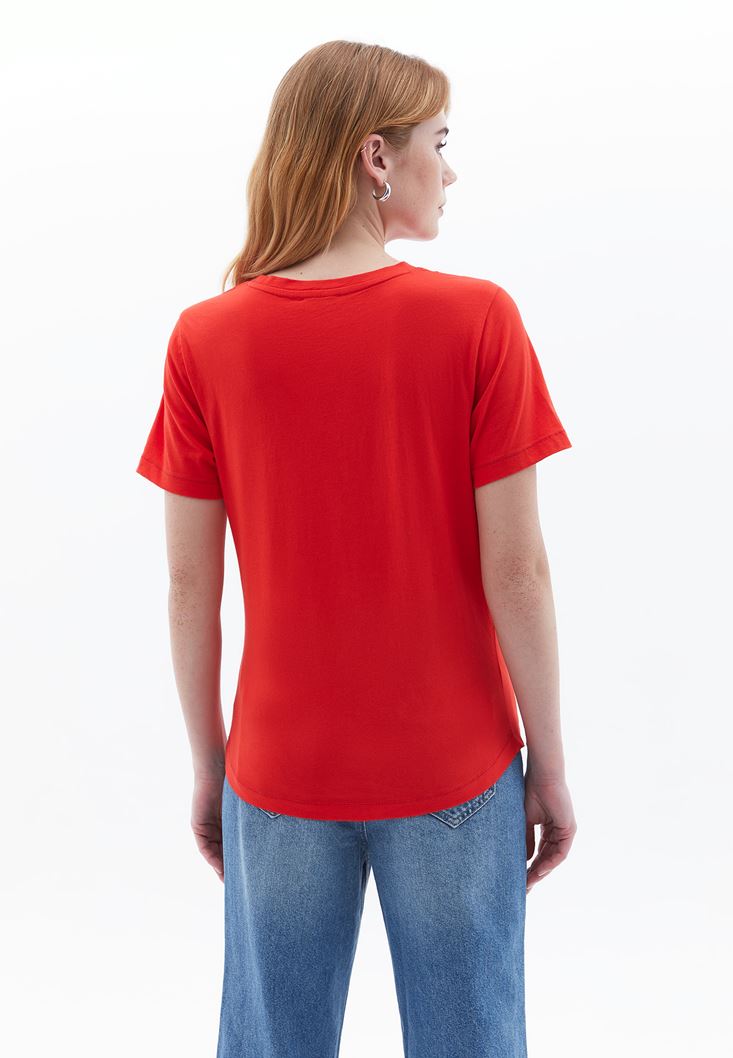 Kırmızı Burgu Detaylı Sıfır Yaka Tişört