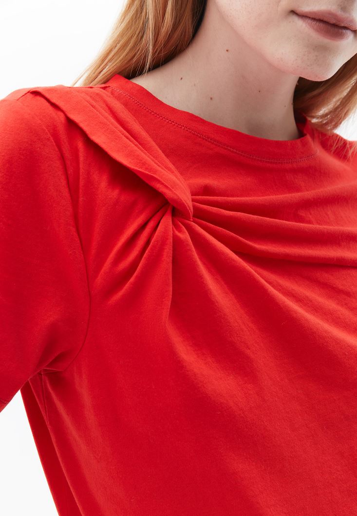 • Bayan Kırmızı Burgu Detaylı Sıfır Yaka Tişört