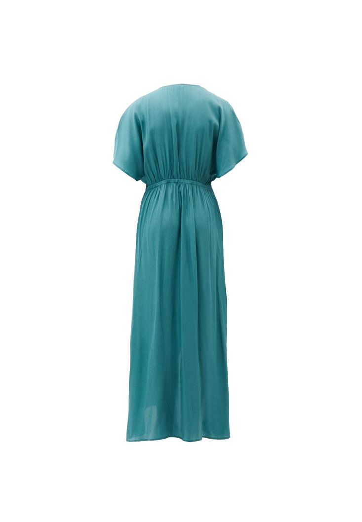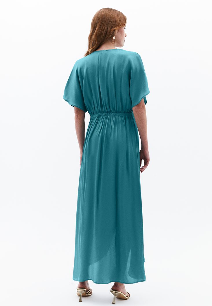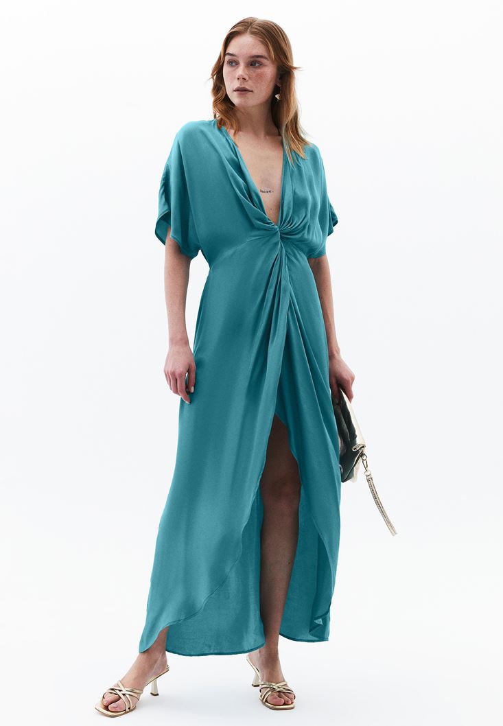 %100 viskon içerikli özel doku, bedenden uzak loose fit, ön bel kısmı burgu detaylı, derin V yaka, uzun boy kesim, yarım kollu.