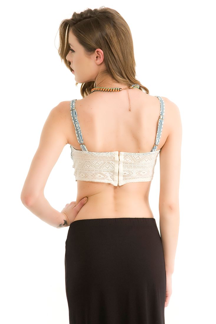 Arkadan çıtçıtlı, önü düğmeli gürünümlü, omuz askılı kısa büstiyer.