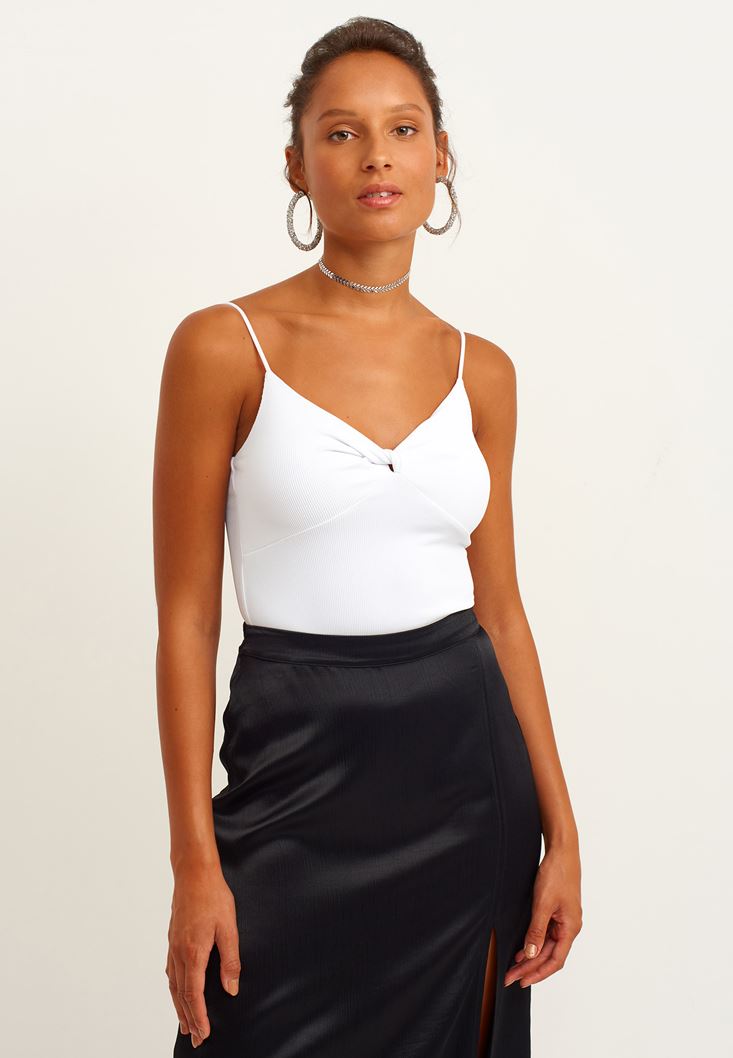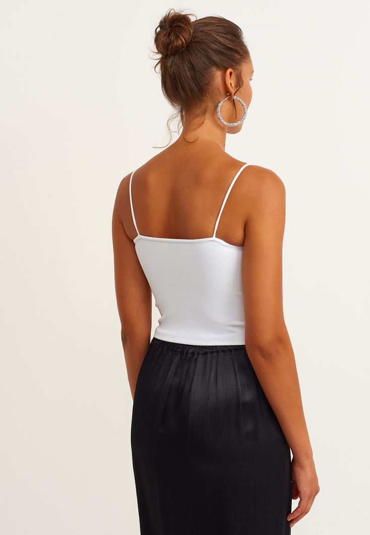 Özel yumuşak doku, ince askılı, ön kısmı büzgü detaylı, crop boy, bedeni saran esnek kalıp, V yaka.