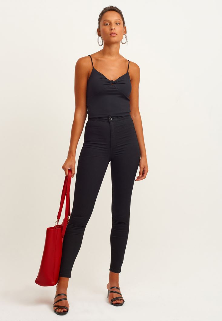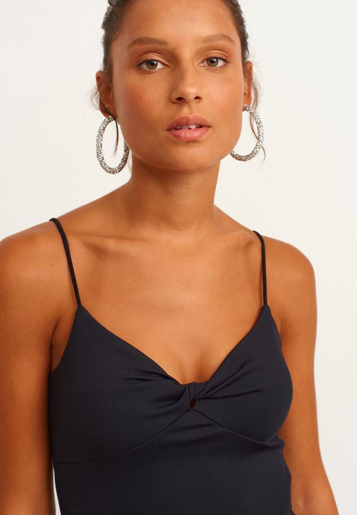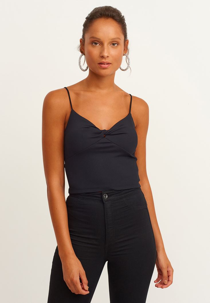 Özel yumuşak doku, ince askılı, ön kısmı büzgü detaylı, crop boy, bedeni saran esnek kalıp, V yaka.