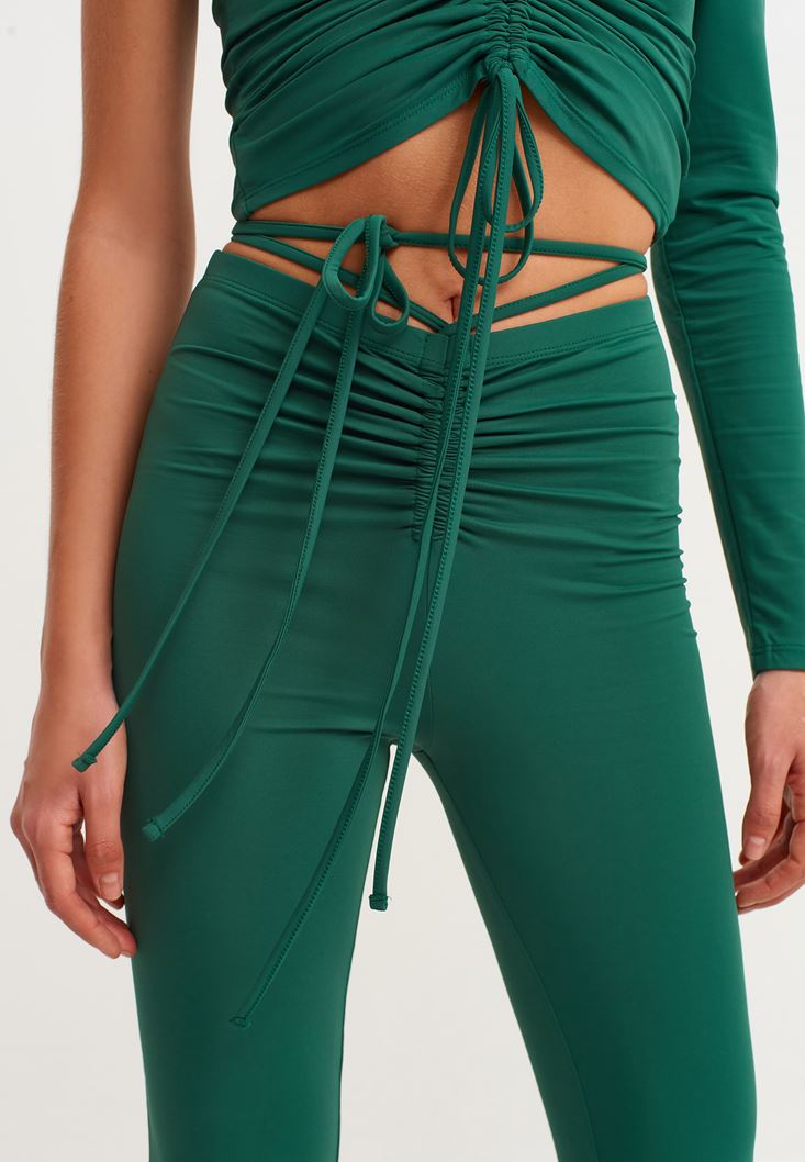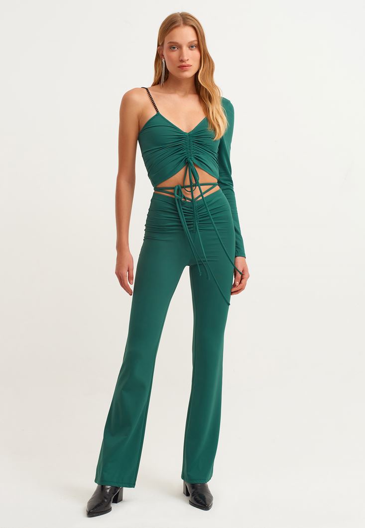 Yeşil Büzgü Detaylı Bağlamalı Pantolon