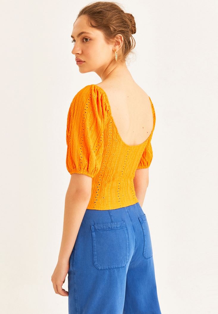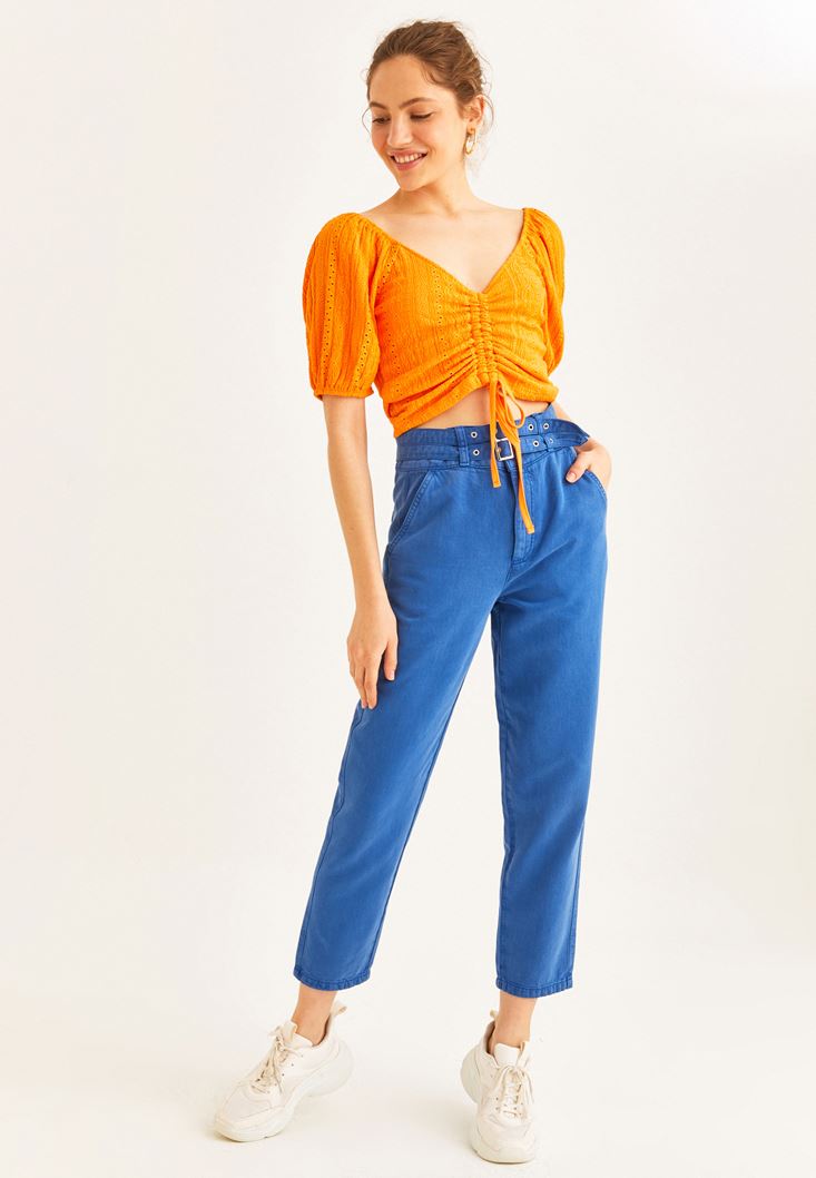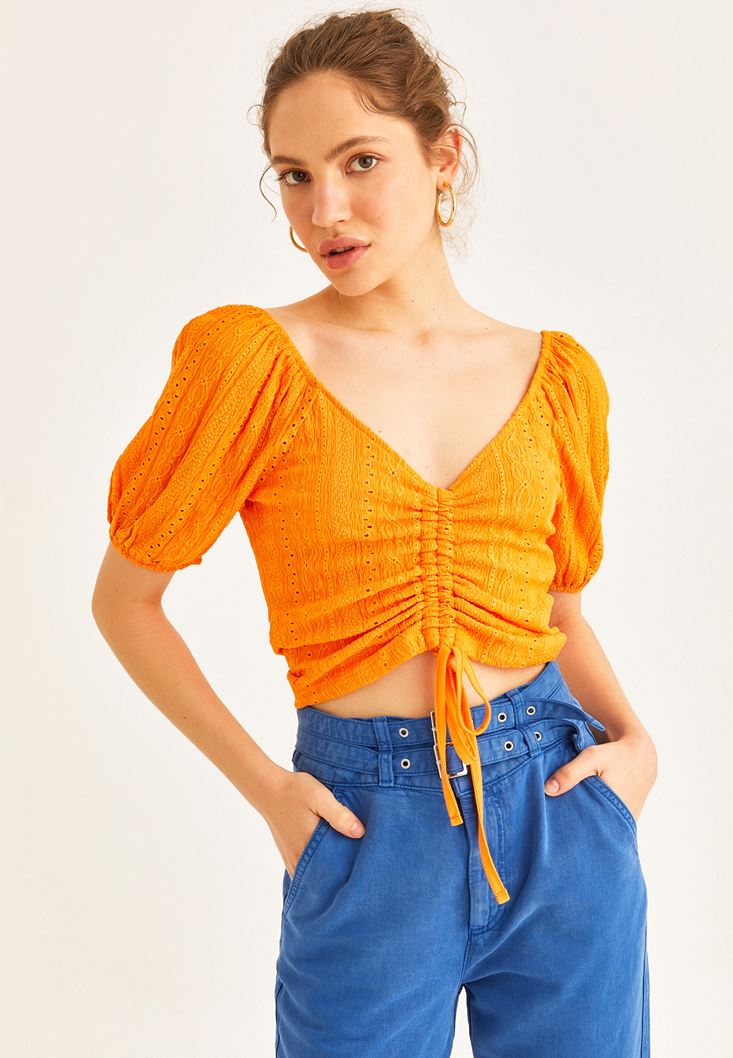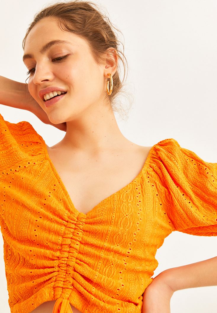 • Bayan Turuncu Büzgü Detaylı Kısa Bluz