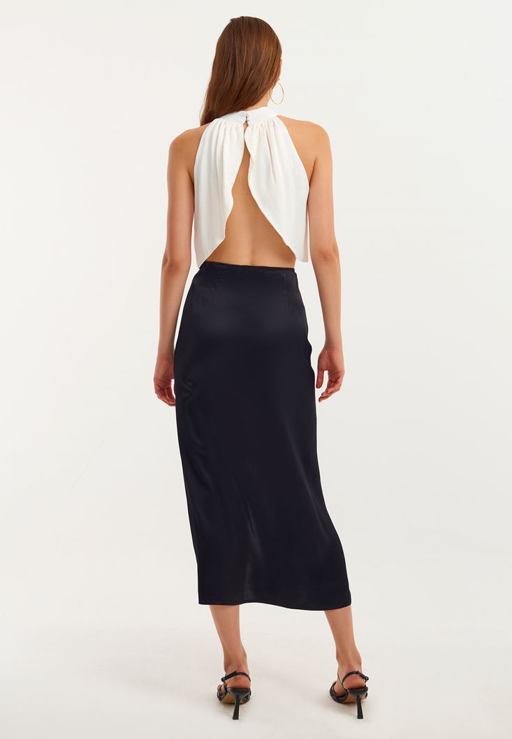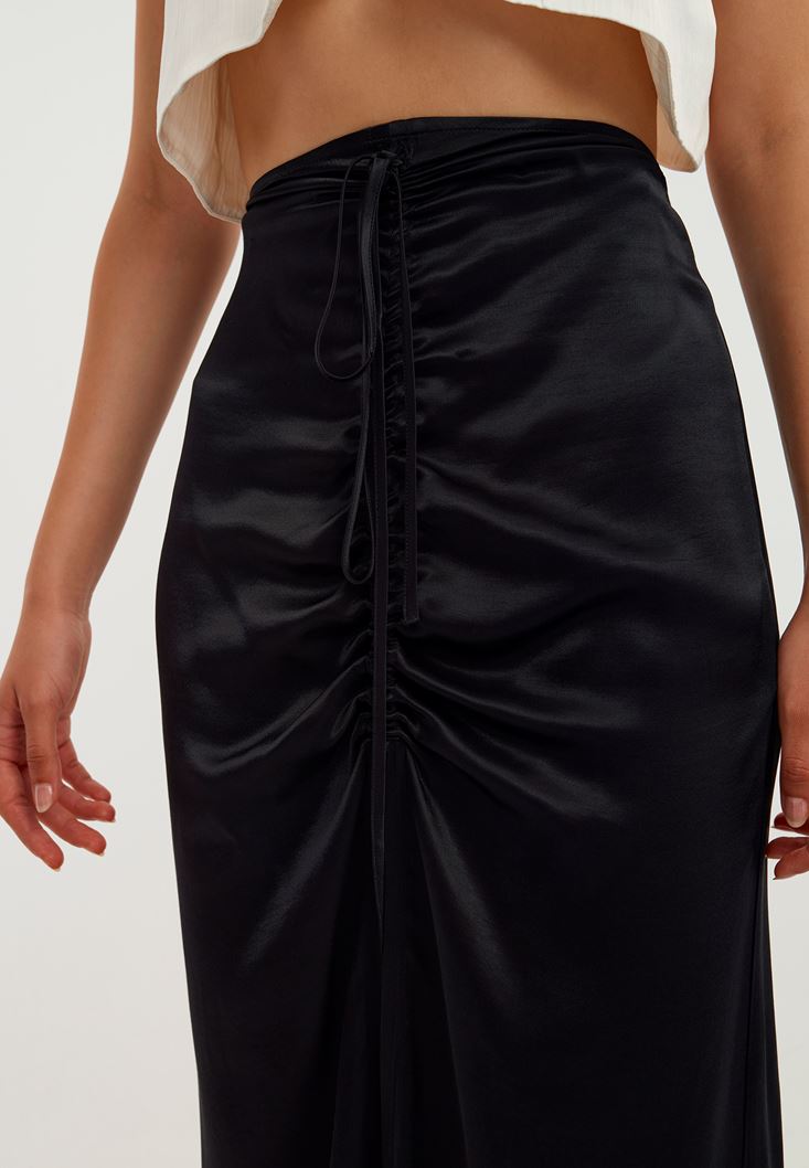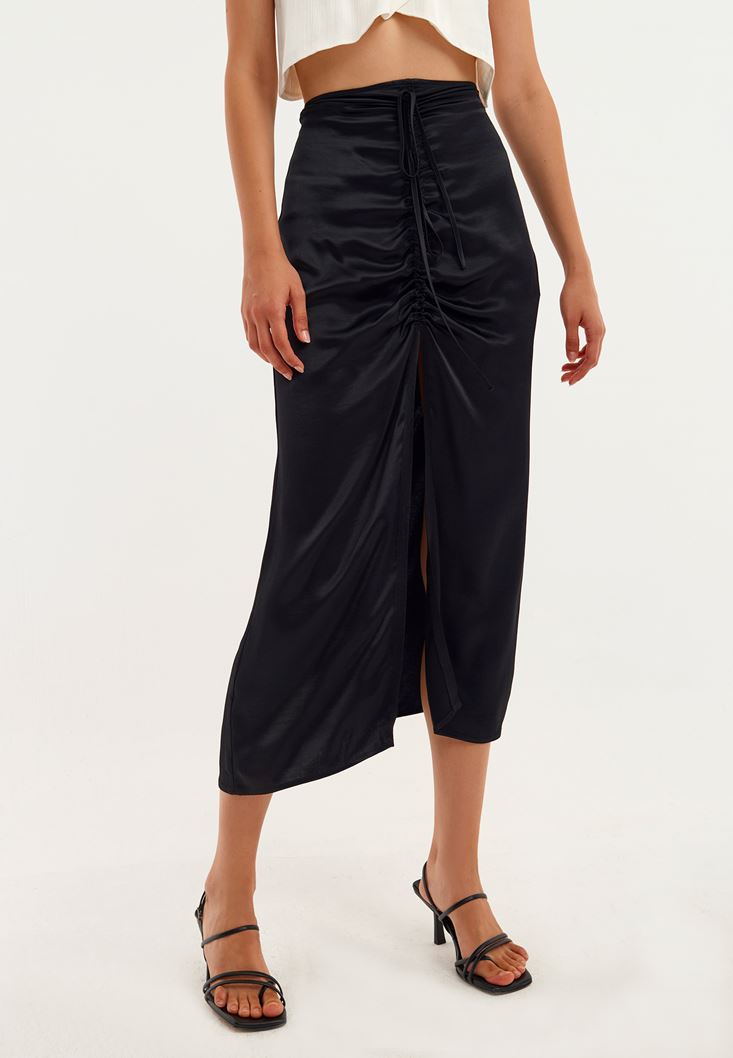 %100 viskon içerikli, yüksek bel, midi boy, ön kısmı ayarlanabilir büzgülü, önden yırtmaçlı, yan kısmında gizli fermuar, saten görünümlü parlak doku.