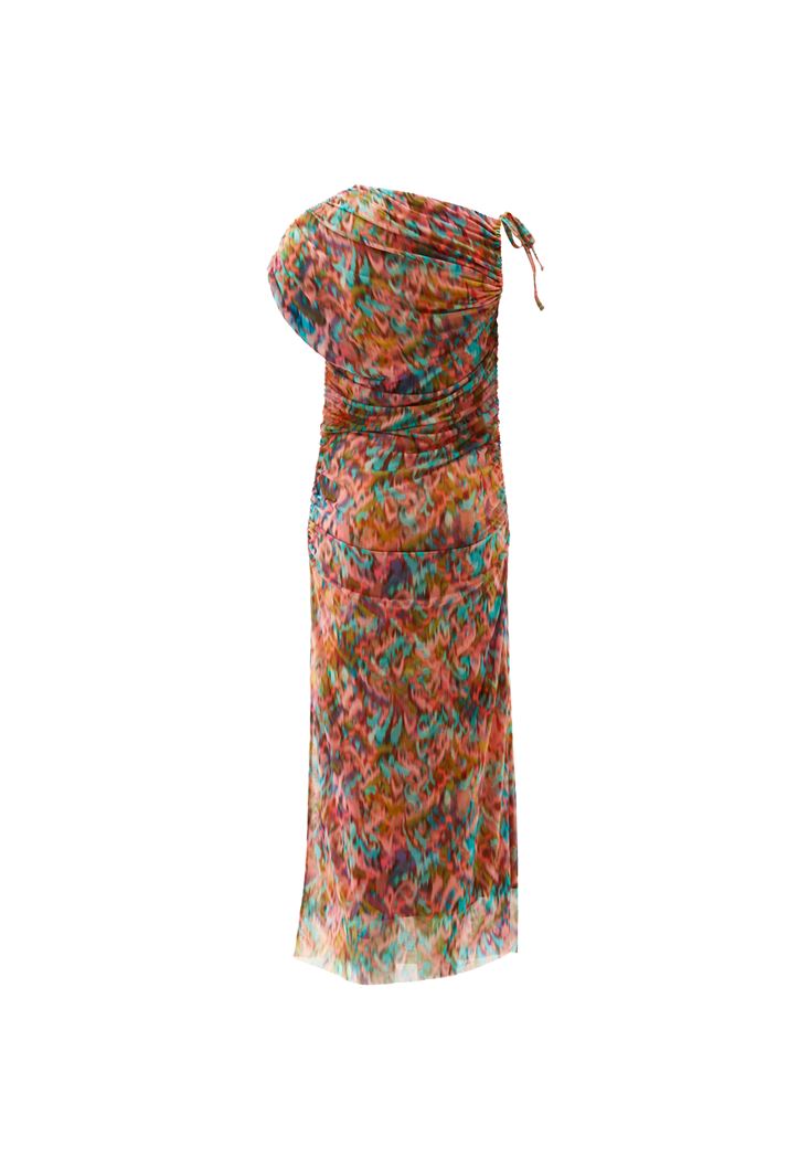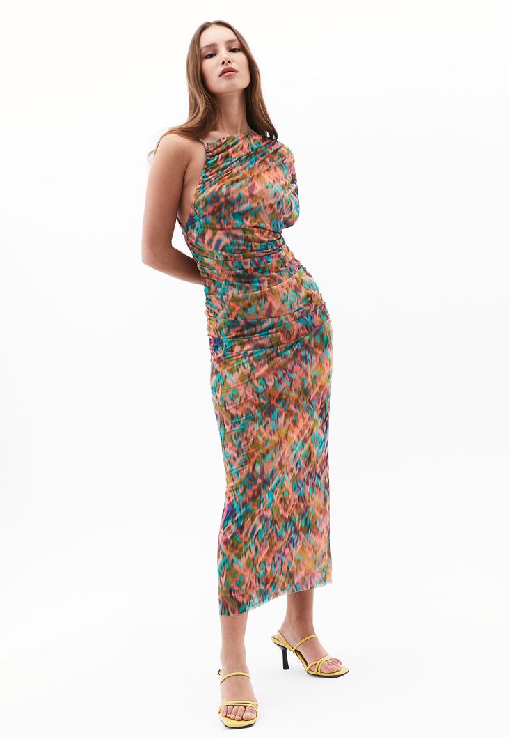 Çok Renkli Büzgü Detaylı Midi Elbise
