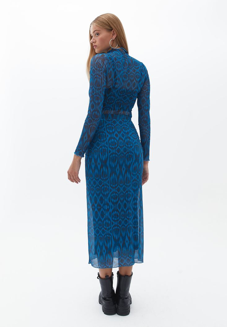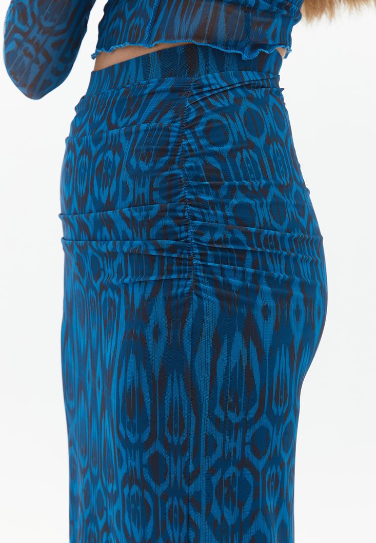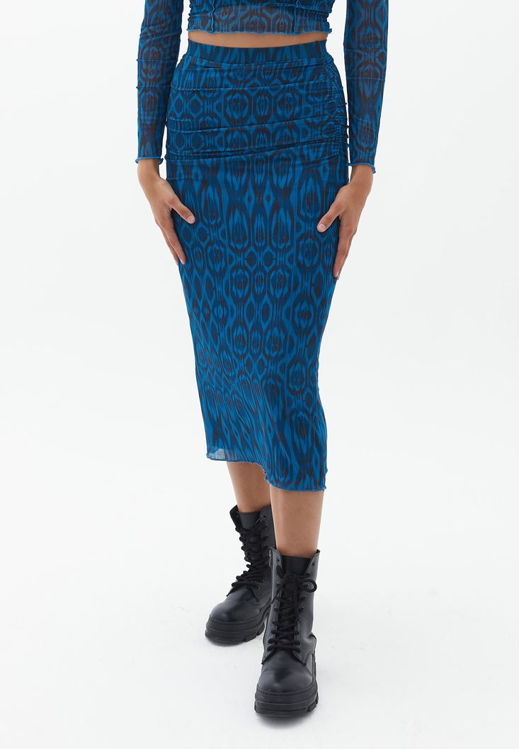 Desenli tül doku, yüksek bel, midi boy, beli lastikli, iki yanı büzgülü, içi astarlı.