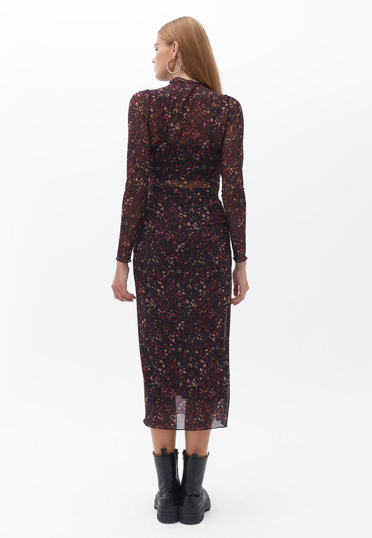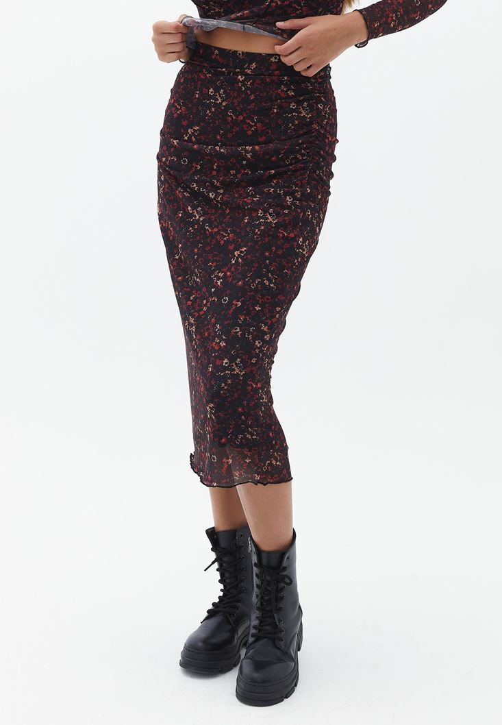 Desenli tül doku, yüksek bel, midi boy, beli lastikli, iki yanı büzgülü, içi astarlı.