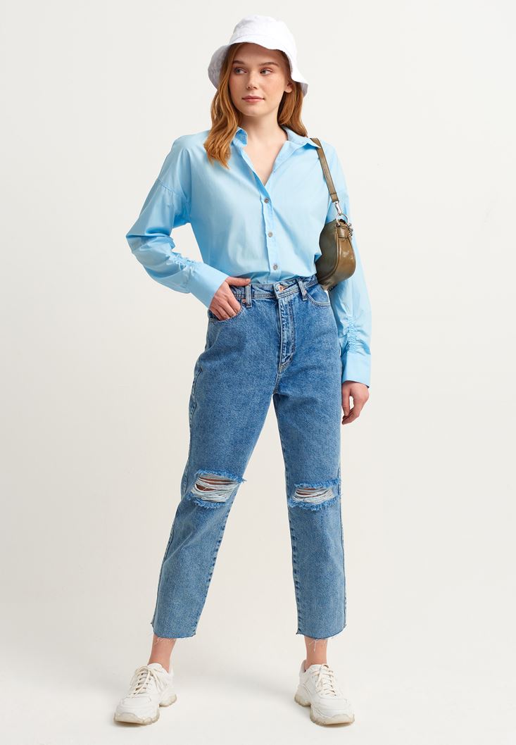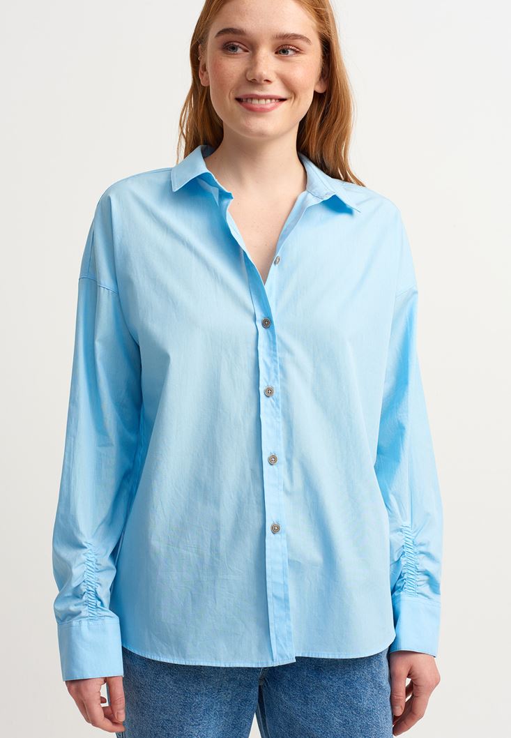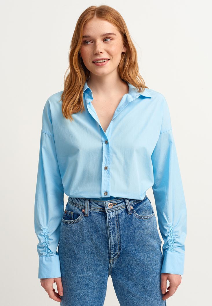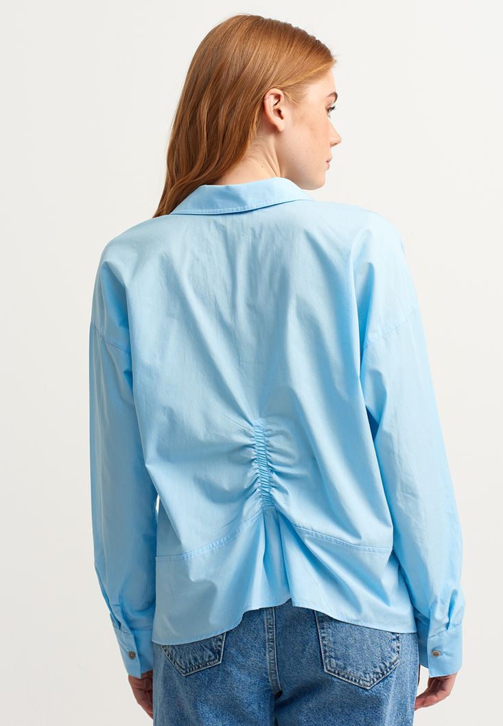 • Bayan Mavi Büzgü Detaylı Pamuklu Gömlek