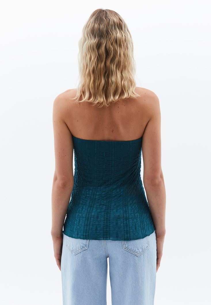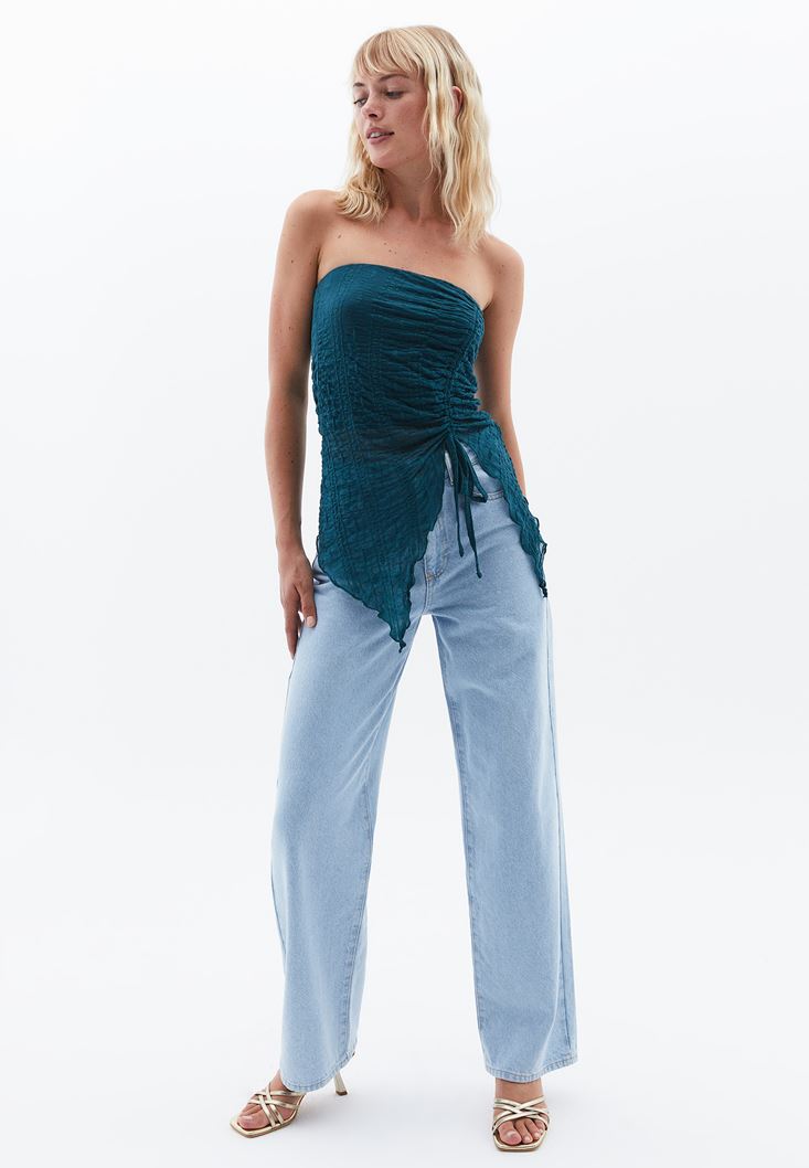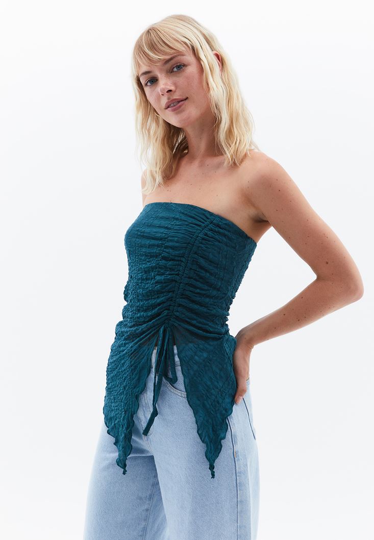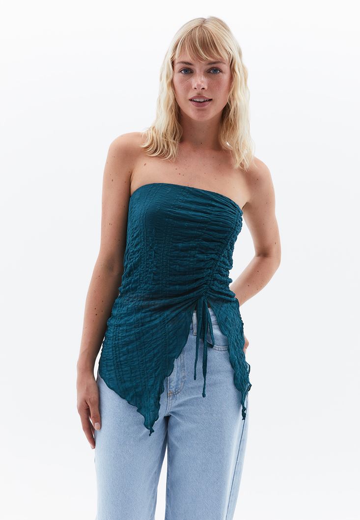 Bedeni saran fit, asimetrik kesim, straplez yaka, ön beden kısmı büzgü detaylı, içi astarlı.