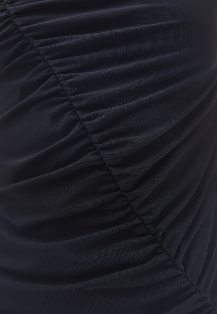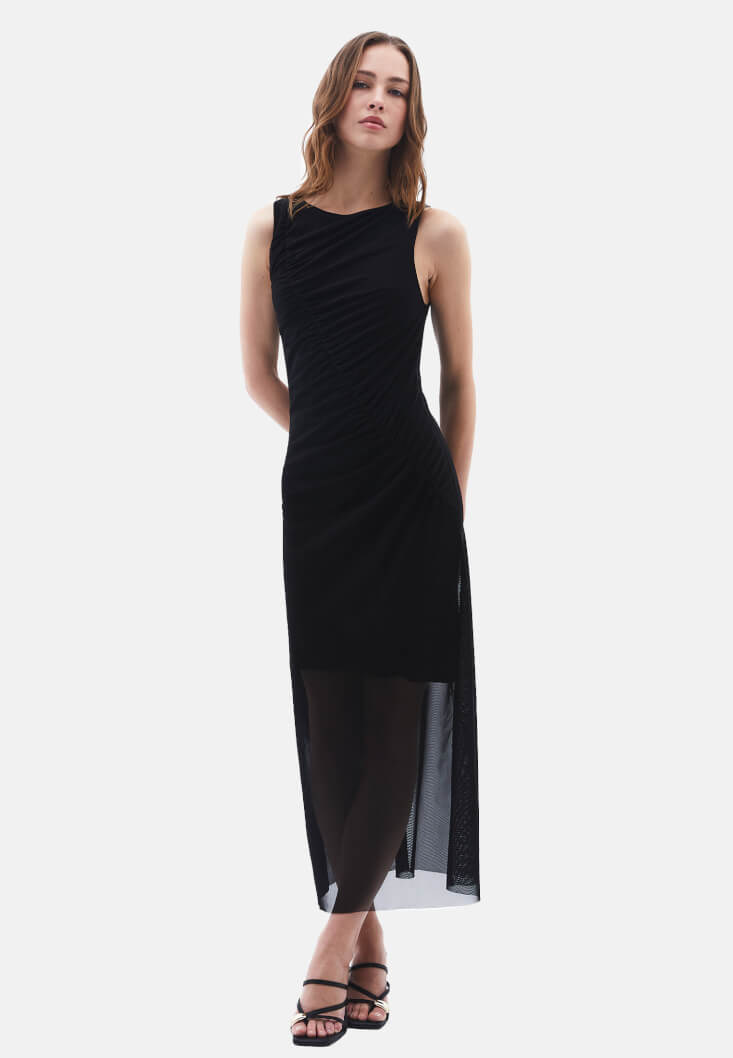 Bot yaka tasarımı ve ön bedendeki büzgü detayıyla dikkat çeken bu elbise, sade çizgileri güçlü bir siluetle buluşturuyor. Vücuda oturan formu ve uzun boy kesimiyle hem modern hem feminen bir duruş sunarken, hafif tül dokusu sayesinde stilinize yumuşak bir akış katıyor.