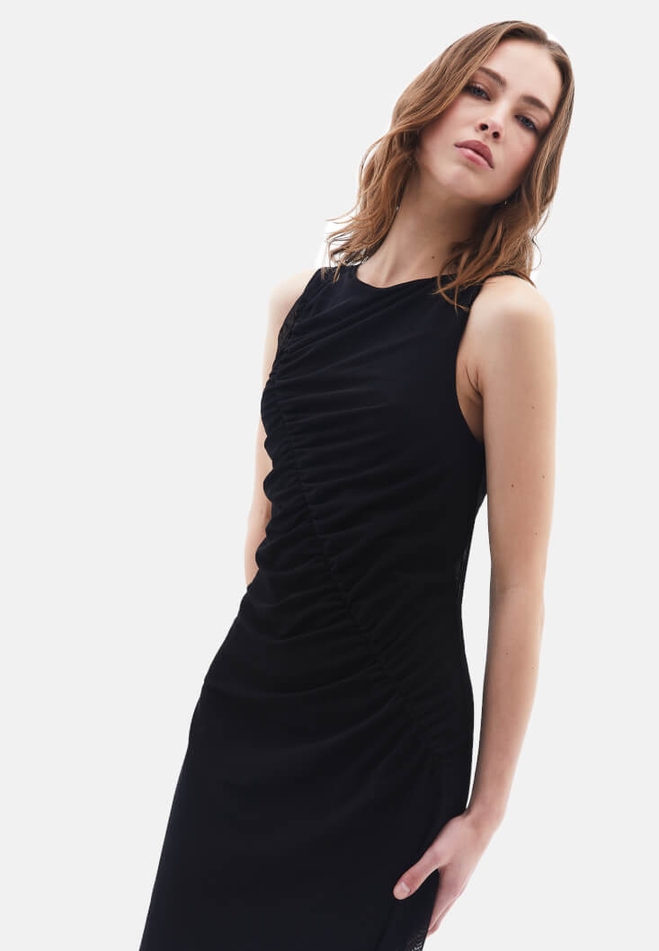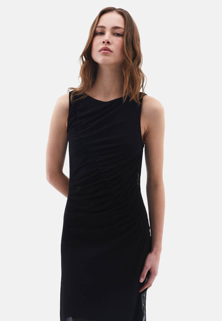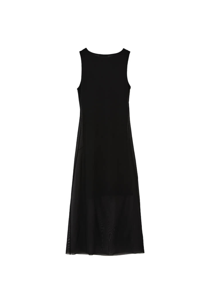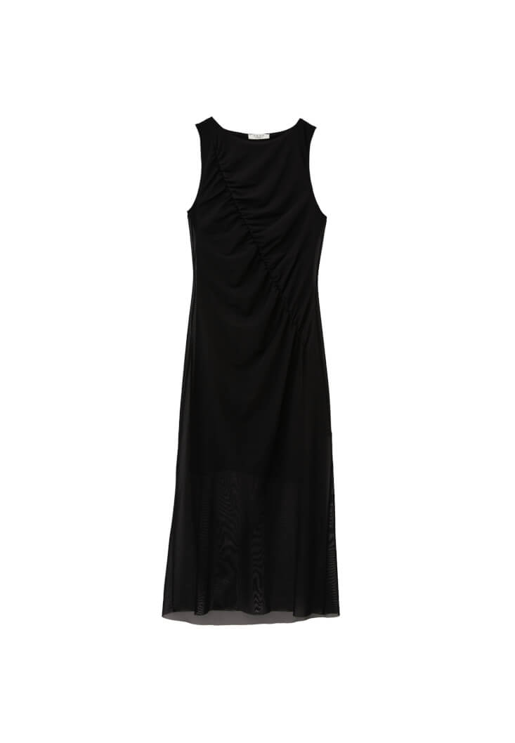 Bedene yakın esnek fit, bot yaka, kolsuz tasarım, ön beden kısmı büzgü detaylı, uzun boy kesim, içi kısa astarlı, transparan tül tasarımlı.