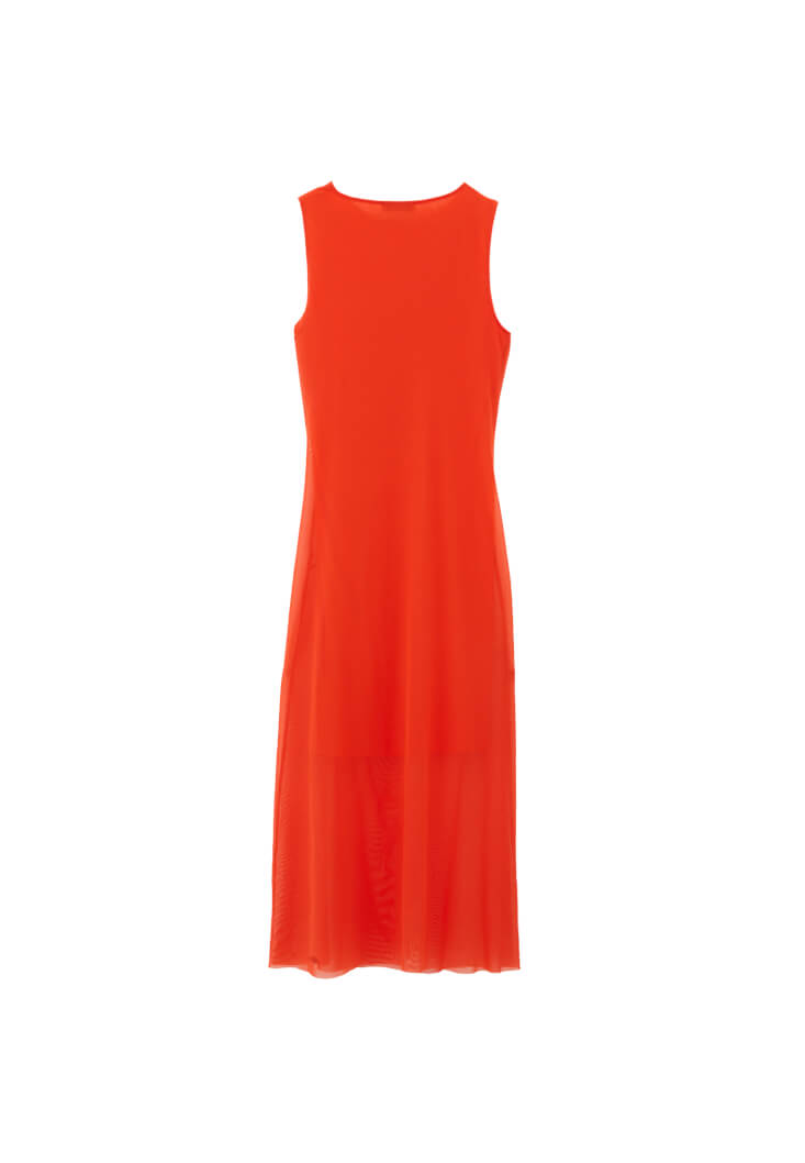 Bedene yakın esnek fit, bot yaka, kolsuz tasarım, ön beden kısmı büzgü detaylı, uzun boy kesim, içi kısa astarlı, transparan tül tasarımlı.