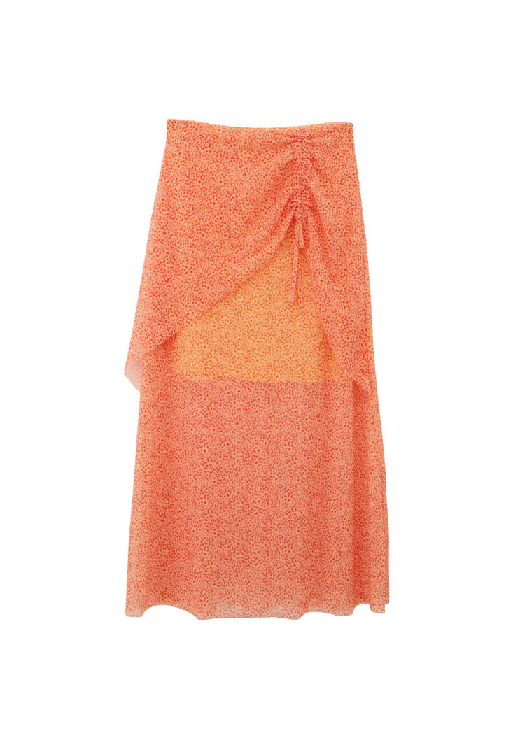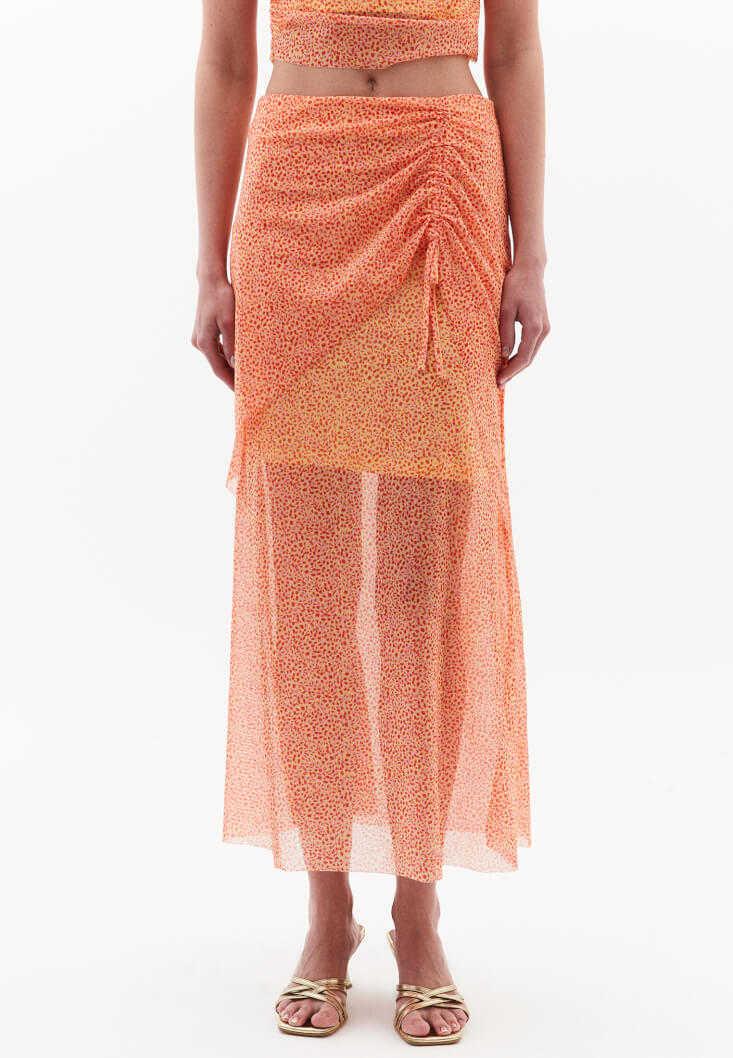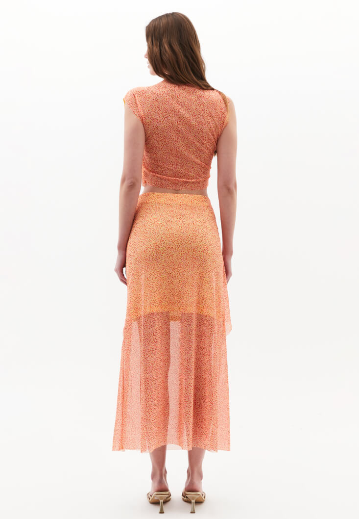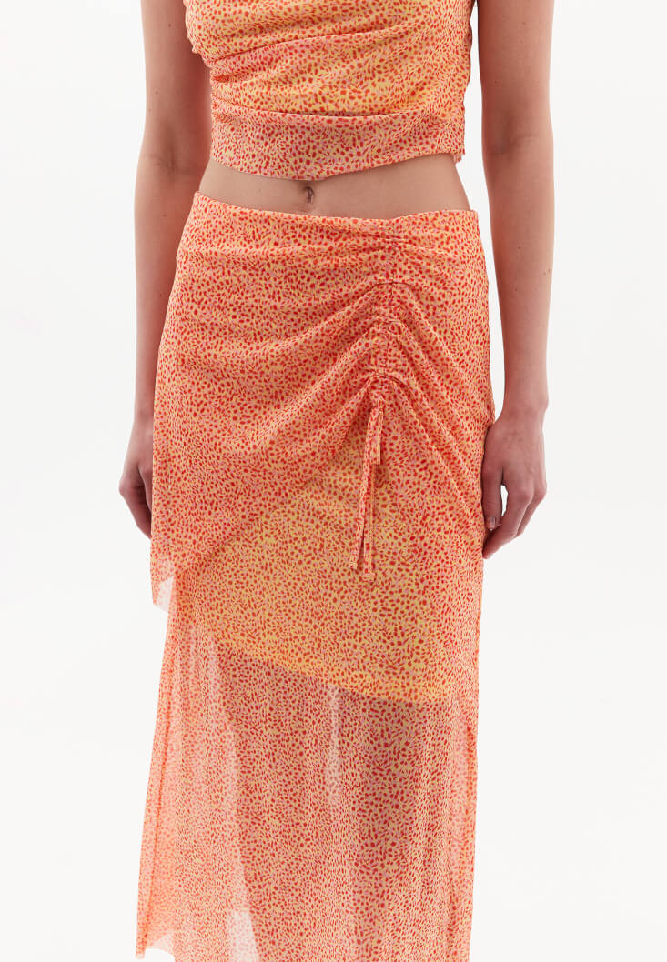 Büzgülü Etek ve Asimetrik Kesim Tişört Kombini