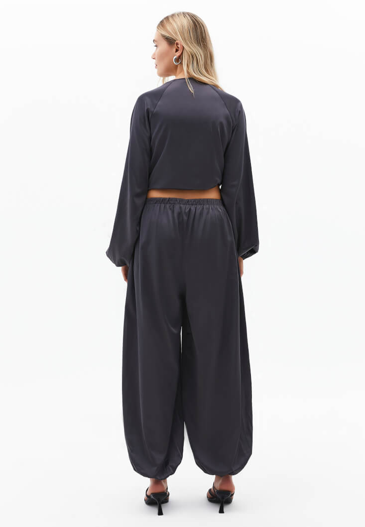 Saten görünümlü doku, viskon karışımlı içerik, bedenden uzak balon fit, yüksek bel, lastikli jogger paça, lastikli jogger paça, iki cepli.