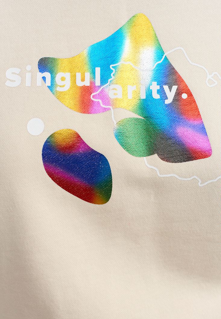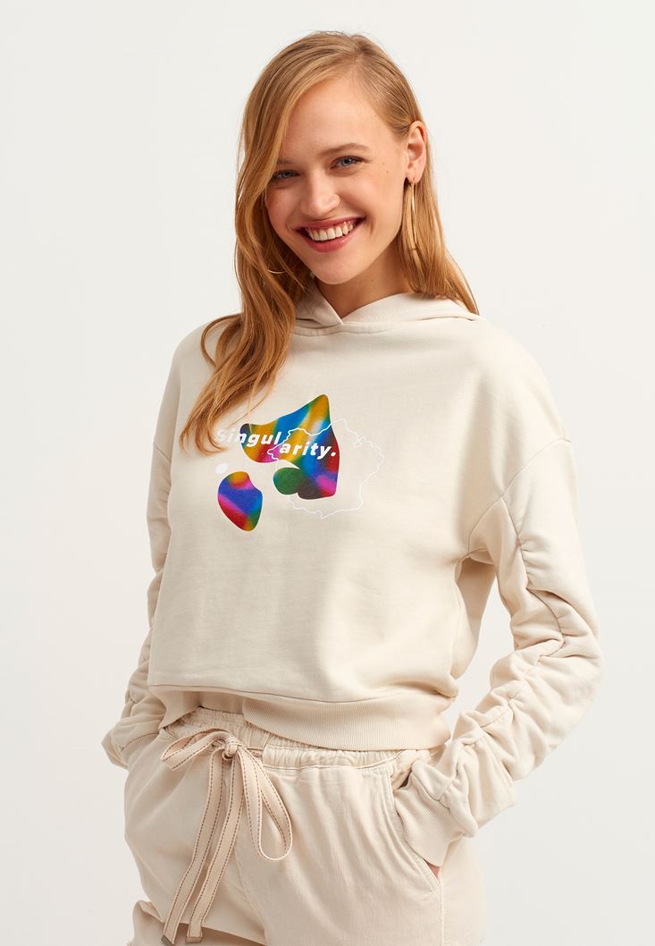 Açık Krem Büzgülü ve Baskı Detaylı Sweatshirt