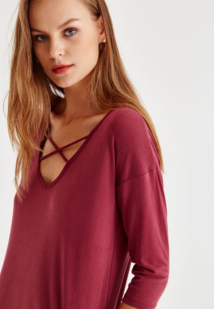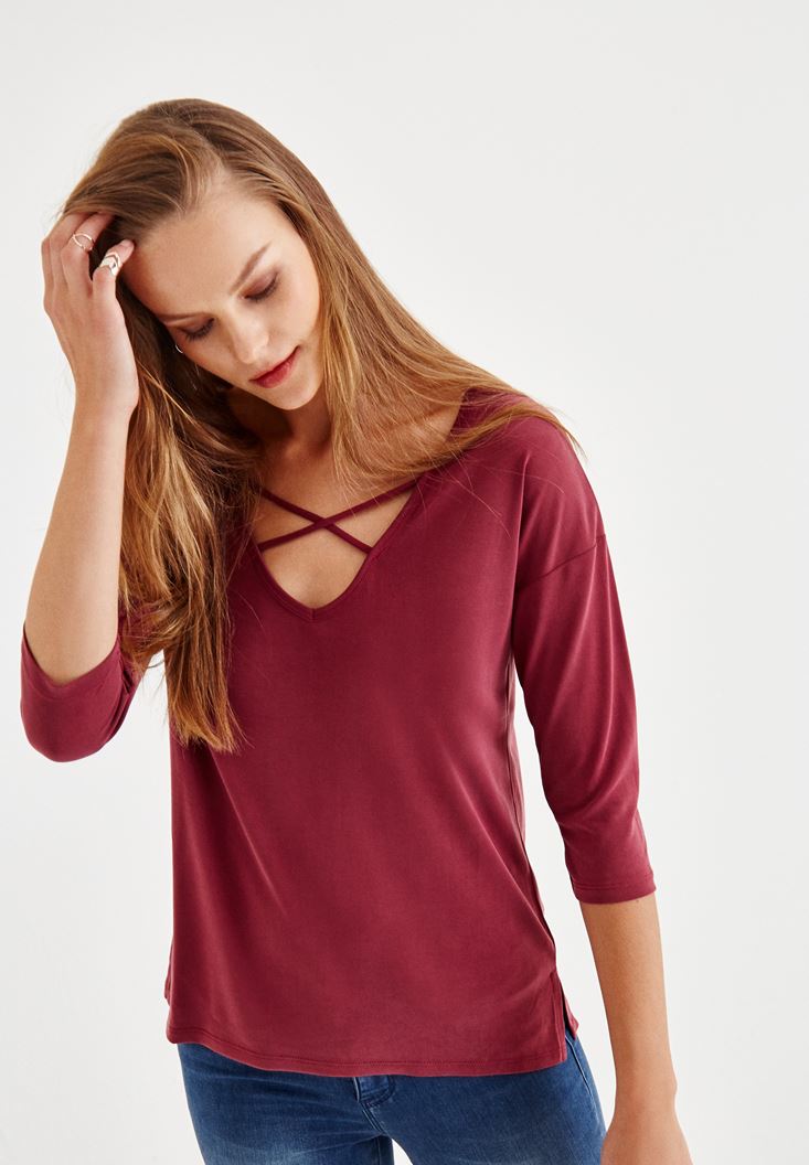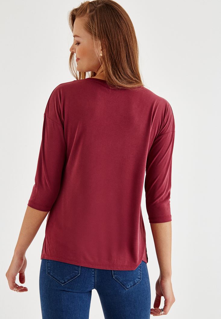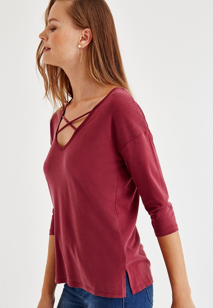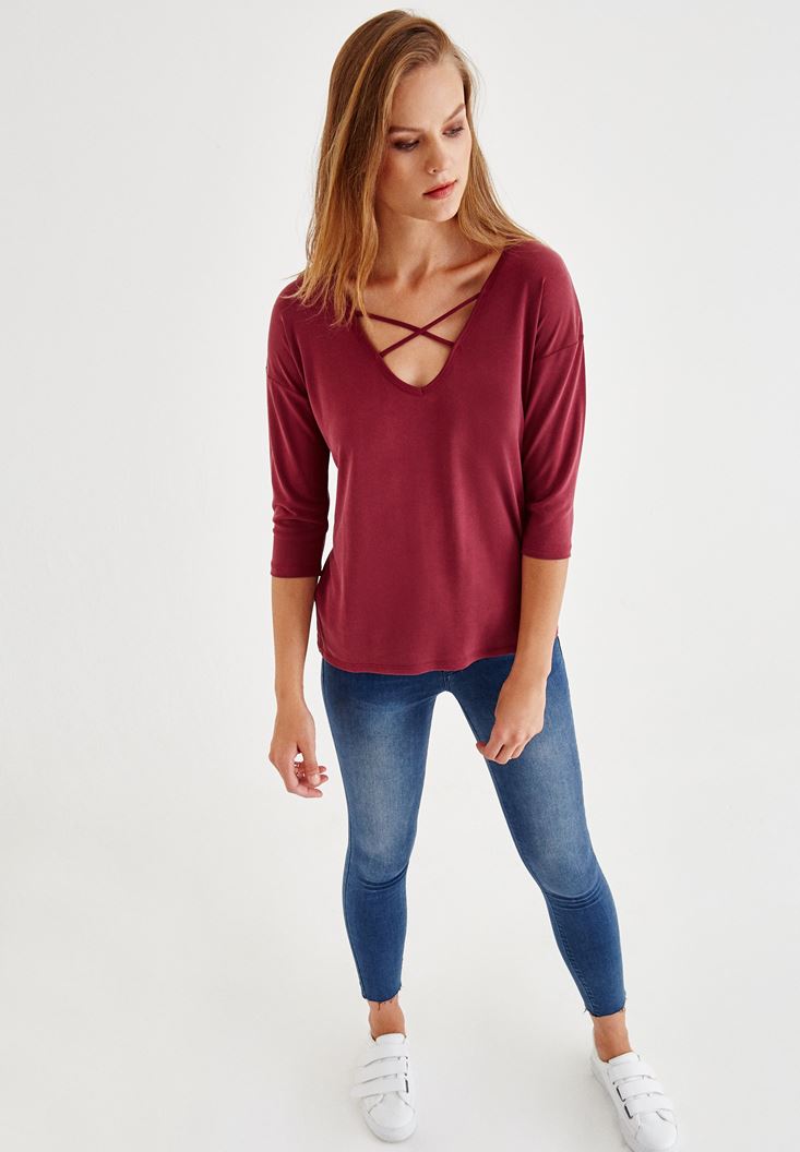 • Bayan Bordo Çapraz Biye Detaylı Bluz