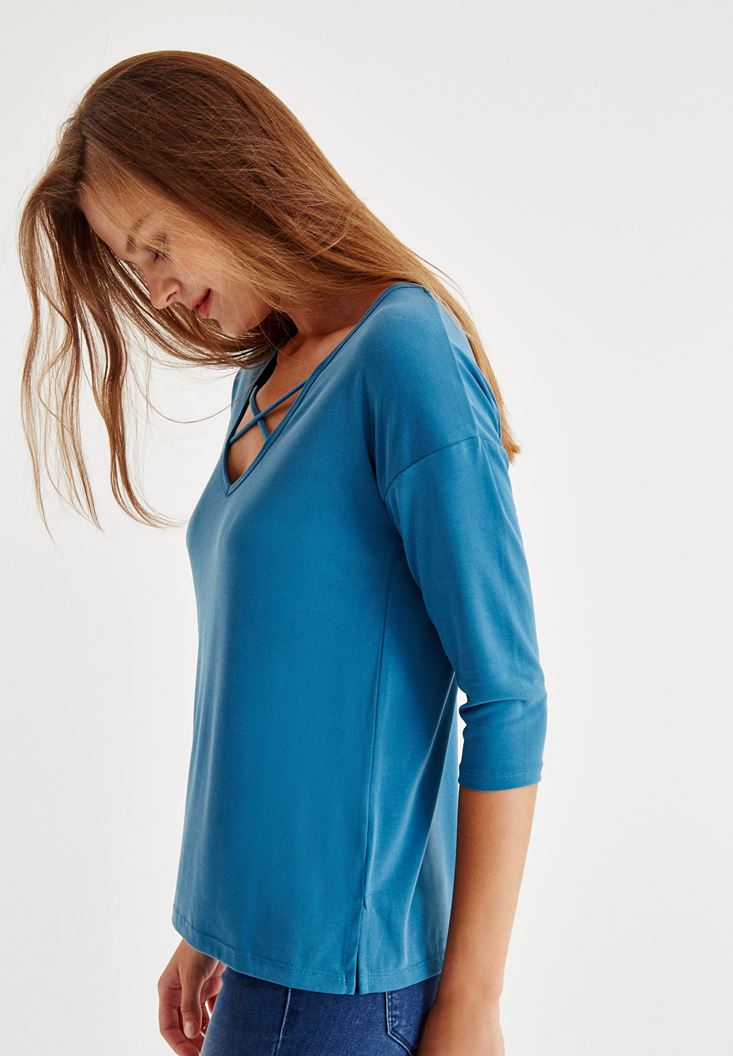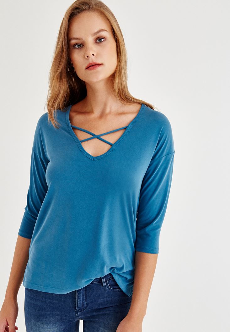 Çapraz biye detayli bluz modeli spor ve rahat bir siklik elde etmenizi saglayacak. Jean pantolon modelleri ile birlikte rahatça kullanabileceginiz bluz modelini birkaç aksesuar dokunusu ile ofis sikliginiza da uyarlayabilirsiniz. Kayin agaci özünden elde edilen, yumusakligi ve yüksek nem emiciligi ile dikkat çeken modal lifi ayni zamanda parlak ve dayaniklidir. Bu özelliklere sahip bluz modeli her zaman konforlu hissetmenizi saglar. V yaka kesimi ve yarim kolu ile her zaman özgür hissedeceginiz bluz modeli yakasinda bulunan çapraz biye detaylari ile hareket kazaniyor. Kumaslardan ilham alan, canli renklere sahip tasarimlari ile öne çikan OXXO, her zaman sik ve konforlu olmanizi saglayacak parçalari ile dolaplarinizin vazgeçilmezlerini size sunuyor.