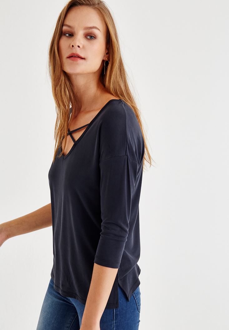 Çapraz biye detayli bluz modeli spor ve rahat bir siklik elde etmenizi saglayacak. Jean pantolon modelleri ile birlikte rahatça kullanabileceginiz bluz modelini birkaç aksesuar dokunusu ile ofis sikliginiza da uyarlayabilirsiniz. Kayin agaci özünden elde edilen, yumusakligi ve yüksek nem emiciligi ile dikkat çeken modal lifi ayni zamanda parlak ve dayaniklidir. Bu özelliklere sahip bluz modeli her zaman konforlu hissetmenizi saglar. V yaka kesimi ve yarim kolu ile her zaman özgür hissedeceginiz bluz modeli yakasinda bulunan çapraz biye detaylari ile hareket kazaniyor. Kumaslardan ilham alan, canli renklere sahip tasarimlari ile öne çikan OXXO, her zaman sik ve konforlu olmanizi saglayacak parçalari ile dolaplarinizin vazgeçilmezlerini size sunuyor.
