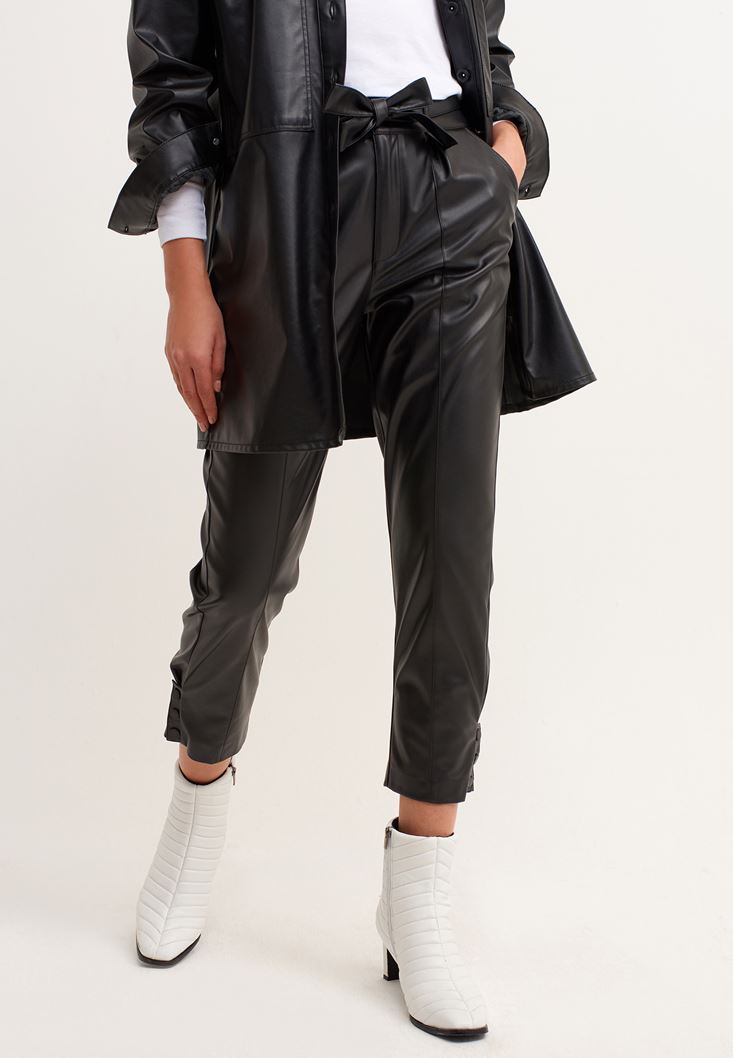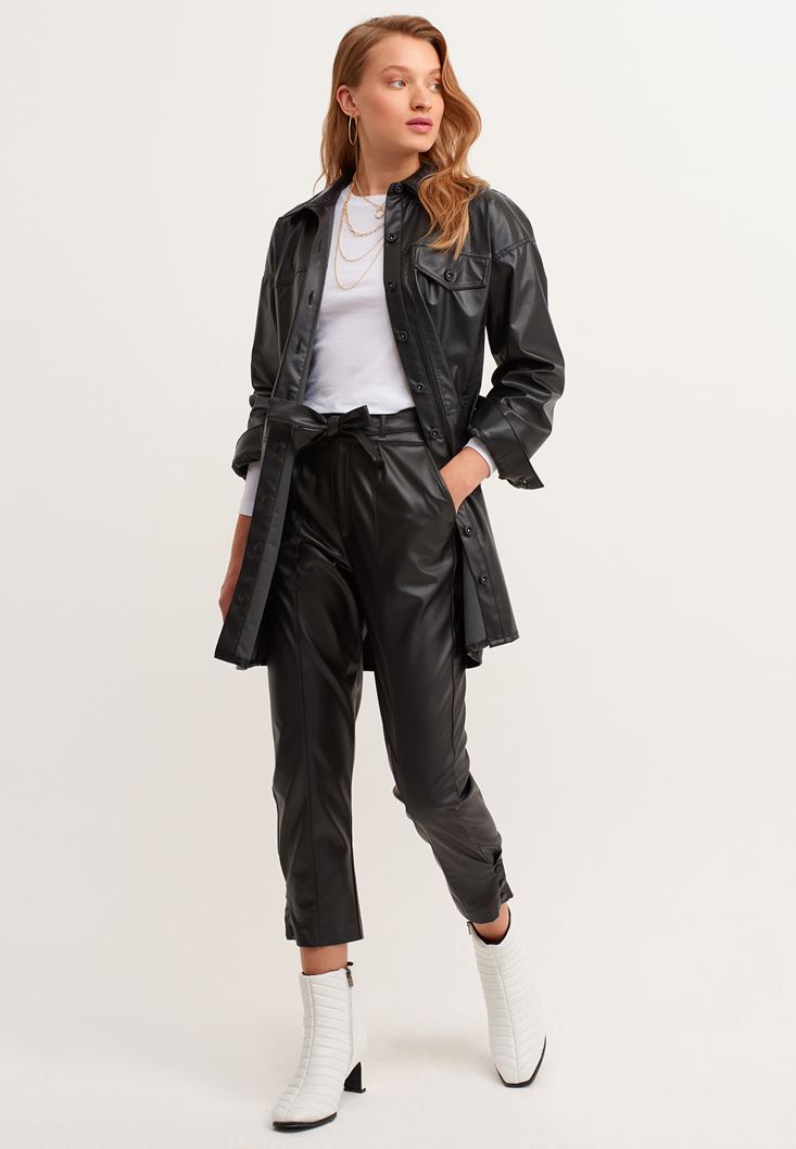 Vegan deri dokusu ile göz alıcı olmayı başaran pantolon modeli, paçasındaki çıtçıt detayı ve kendi kumaşından kemeri ile ön planda! Kombinlerinde rahatlıkla yer verebileceğin vegan deri pantolon ile dilediğin havalı görünüme ulaşabilirsin. Onu crop uzun kollu tişörtlerle ve vegan deri ceketlerle buluşturarak sezonun ritmini de yakalaman mümkün... Aynı zamanda vegan deri pantolon ile oluşturacağın etkiyi postallarla da destekleyebilirsin! :)