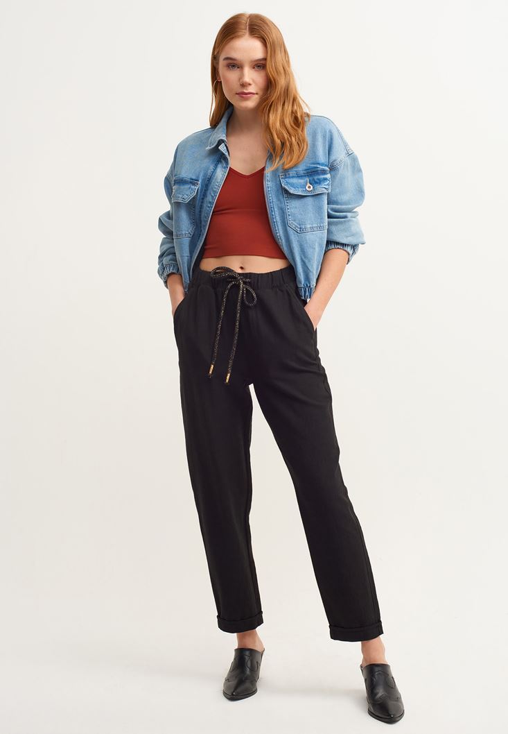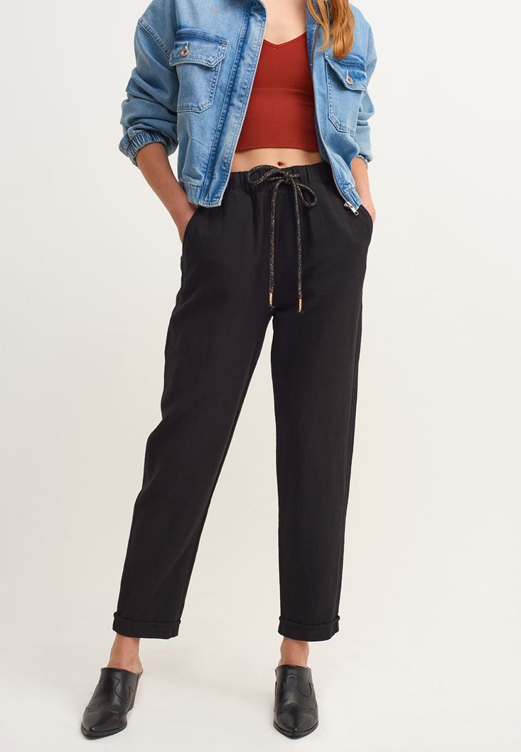 Siyah Carrot-Fit Bağcıklı Pantolon