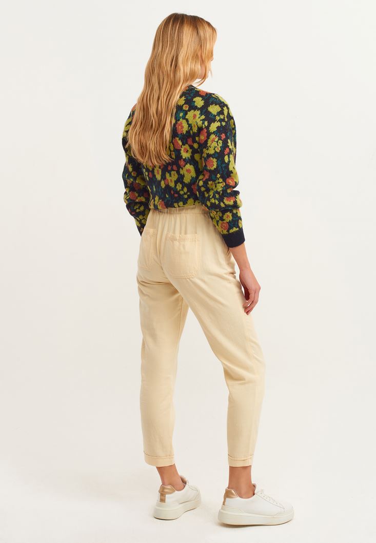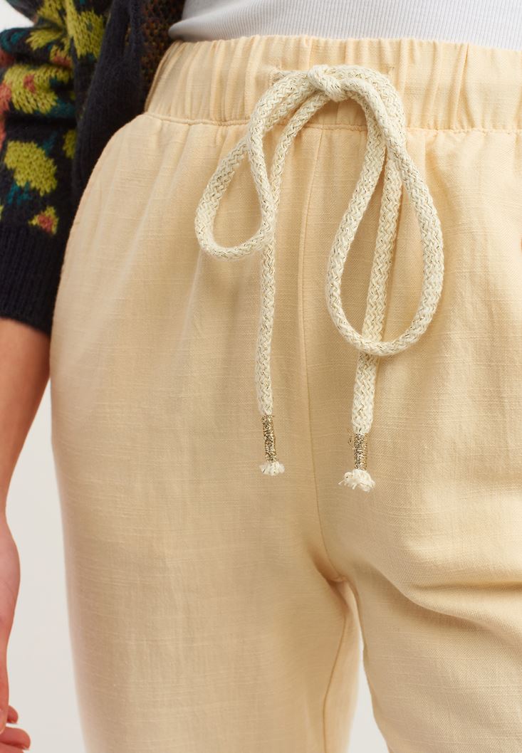 Pamuk ve viskon karışımlı özel doku, iki cepli, beli bağcıklı, slim paça, havuç kalıp, bilekte biten duble paça, bedene yakın rahat fit, yüksek bel.