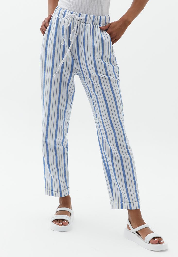 Pamuk ve viskon karışımlı doku, çizgi desenli, havuç kesim, slim paça, bedenden uzak rahat fit, yüksek bel, bilekte biyen paça boyu, beli lastikli ve bağcıklı, önü iki cepli.