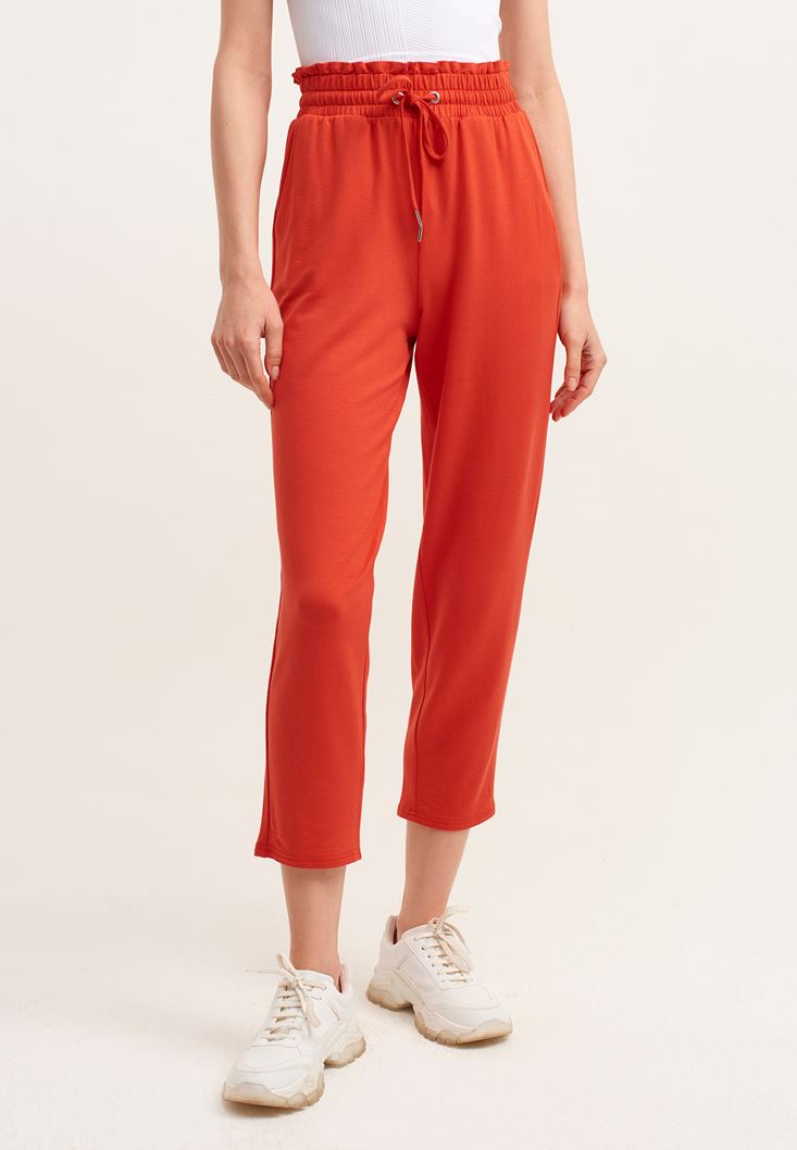 Viskon içerikli yumuşak doku, yüksek bel, büzgülü ve bağcıklı bel detayı, carrot-fit kalıp.