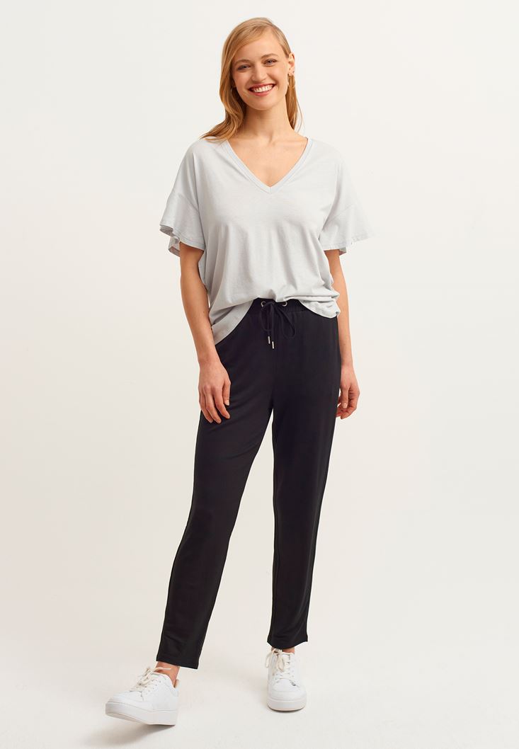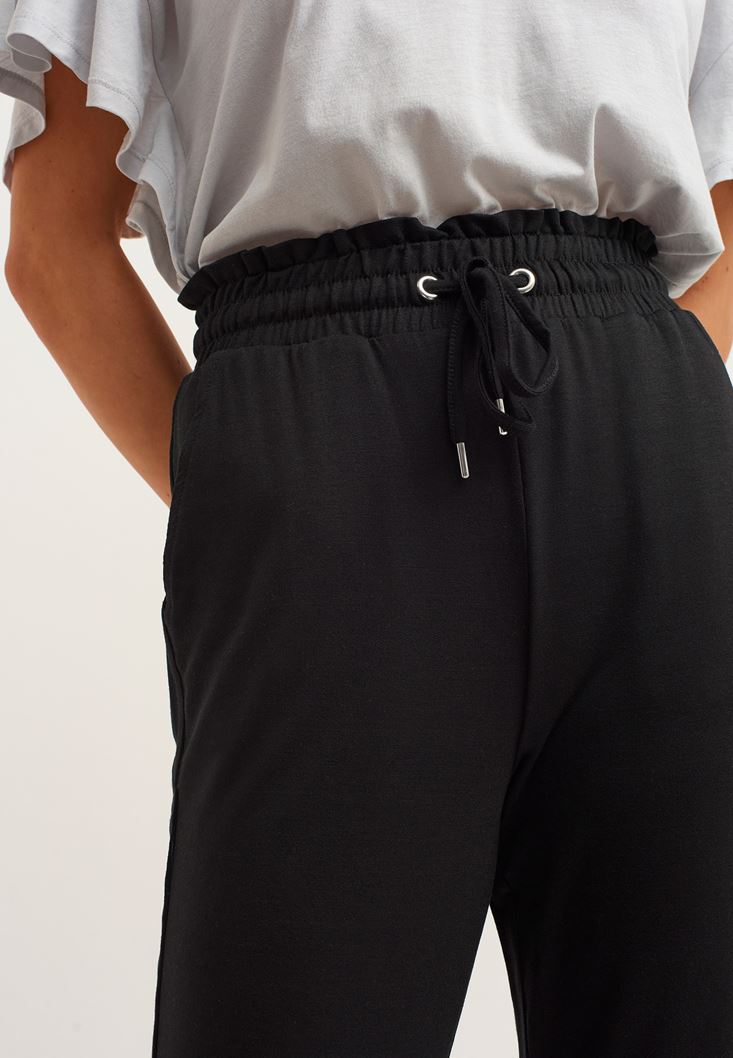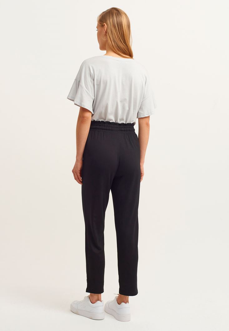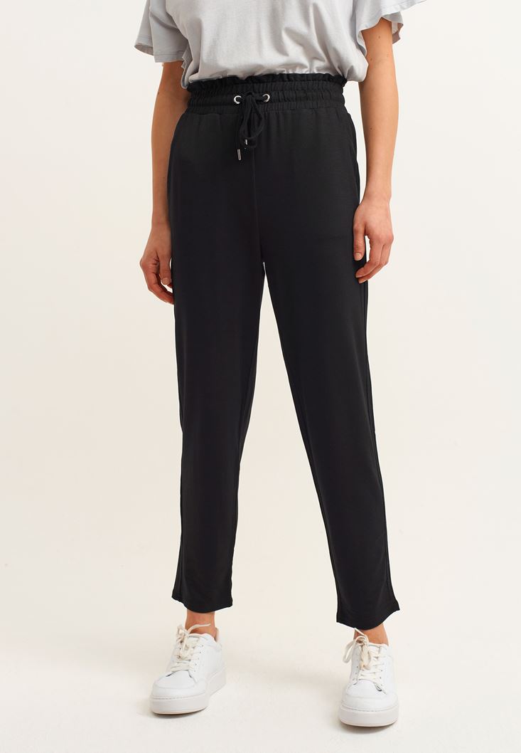 Viskon içerikli yumuşak doku, yüksek bel, büzgülü ve bağcıklı bel detayı, carrot-fit kalıp.