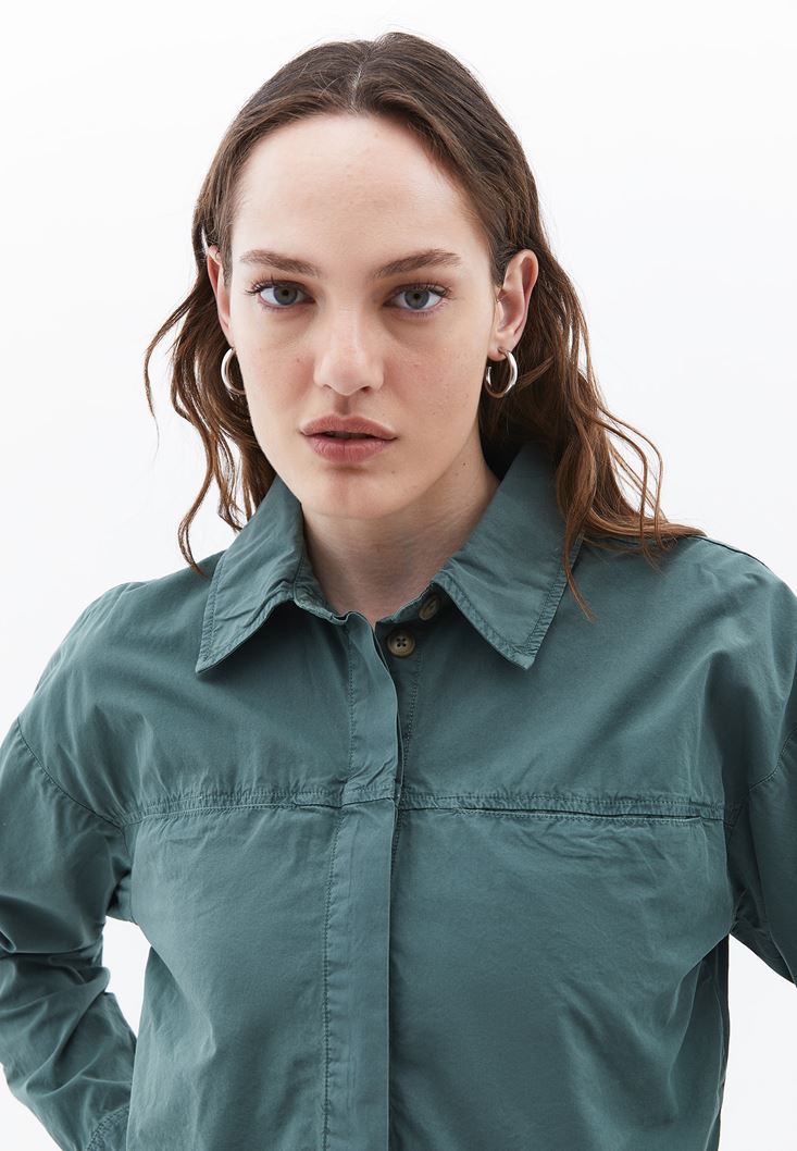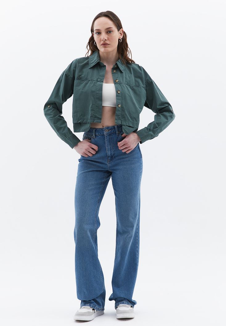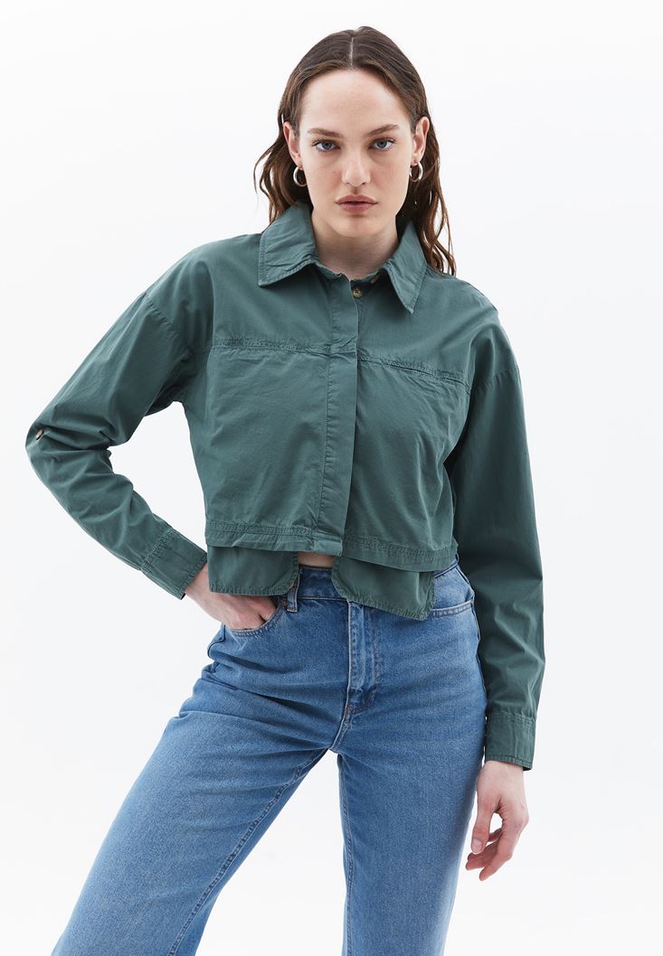 • Bayan Yeşil Cep Detaylı Crop Gömlek