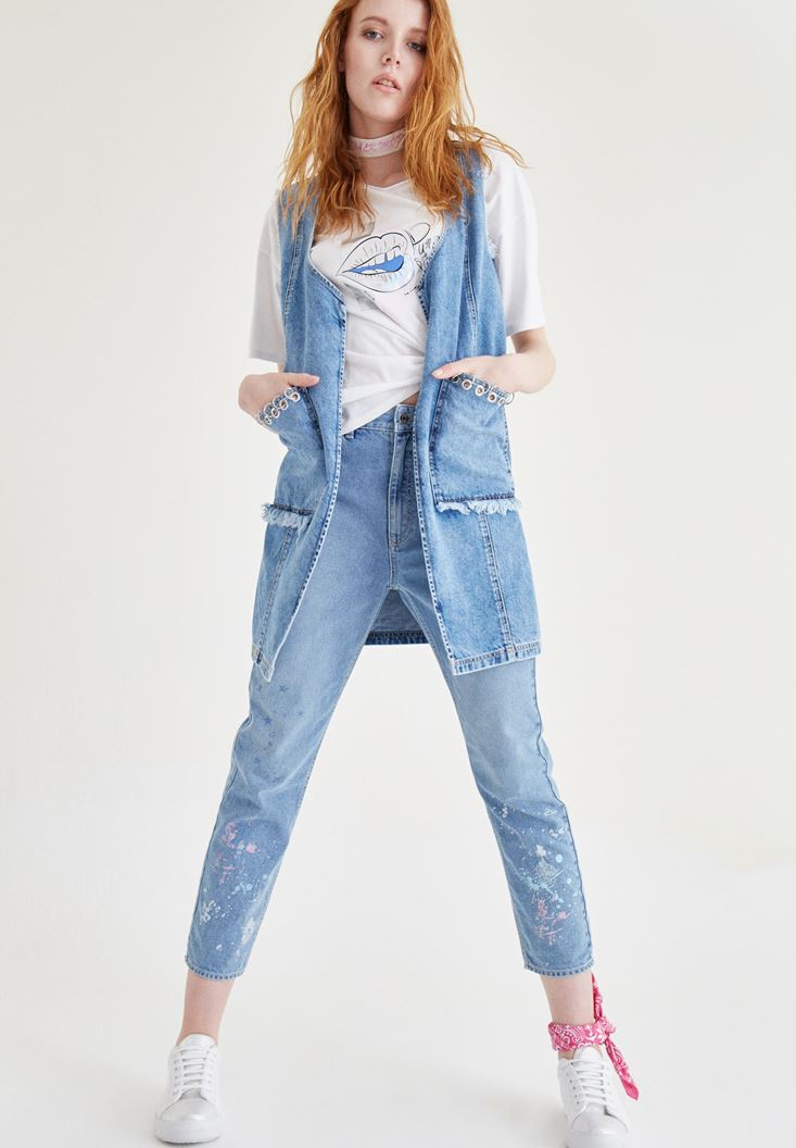 Denim kumas, püsküllü kol, metal detaylar! Biraz asi ve oldukça havali bir tarzin habercisi OXXO cep detayli jean yelek özellikle skinny jeanlar için en uyumlu kombinlerin vazgeçilmez parçasi oluyor. Bütün sadeligiyle bile belirgin bir tarzin çizgilerini tasiyan “denim on denim” modasina ayak uyduruyorsaniz imajinizi dinamik bir sekilde tamamlayabileceksiniz. Skinny jeanlerin yaninda yilin modasi yirtik pantolonlar ve dökümlü tisörtlerle de kullanabilirsiniz. Moms jeanlerinizin paçalarini kivirip yenilikçi çizginizi belirginlestirirken bol kesim giyimleri de rahatlikla tasiyabileceginizi gösterebilirsiniz. Bileginize baglayacaginiz bir bandana, saçiniza takacaginiz bir saç bandi ile biraz da eskilerden doneler barindararak zenginlestirebilirsiniz. Jeanlerin hemen her seyle olan uyumunu metal aksesuarlarla vurgulayarak yeleginizinde de olan metal detaylari daha fazla ortaya çikarabilirsiniz.