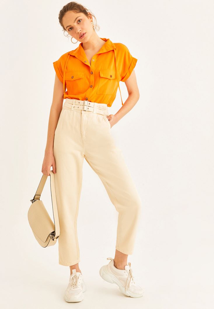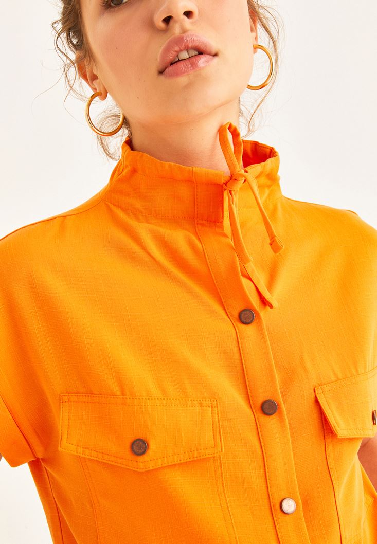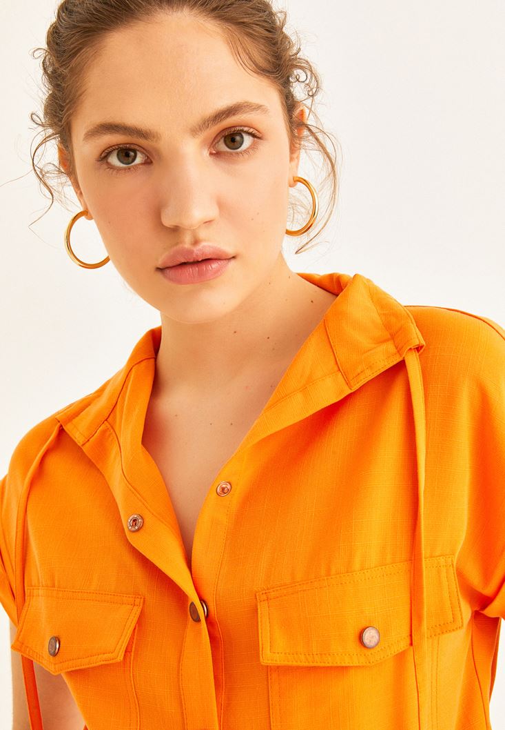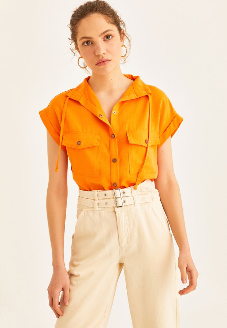 • Bayan Turuncu Cep Detaylı Kolsuz Gömlek