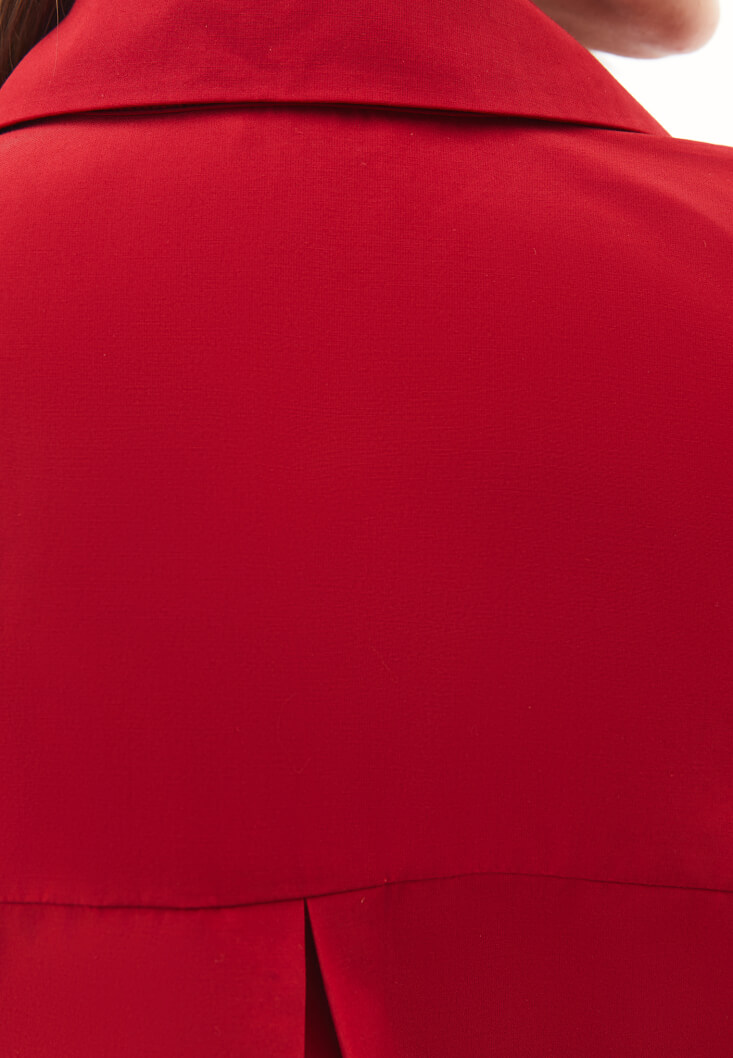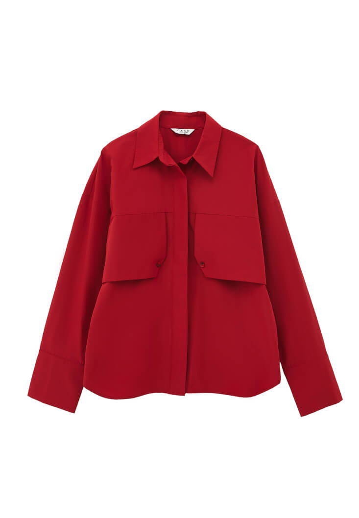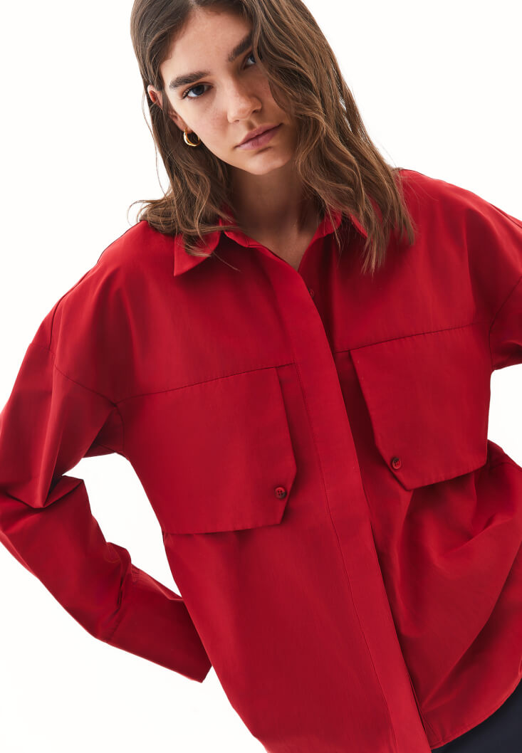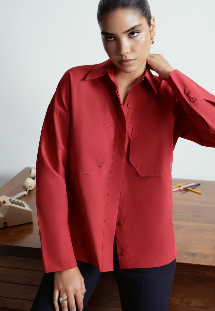 • Bayan Kırmızı Cep Detaylı Oversize Gömlek