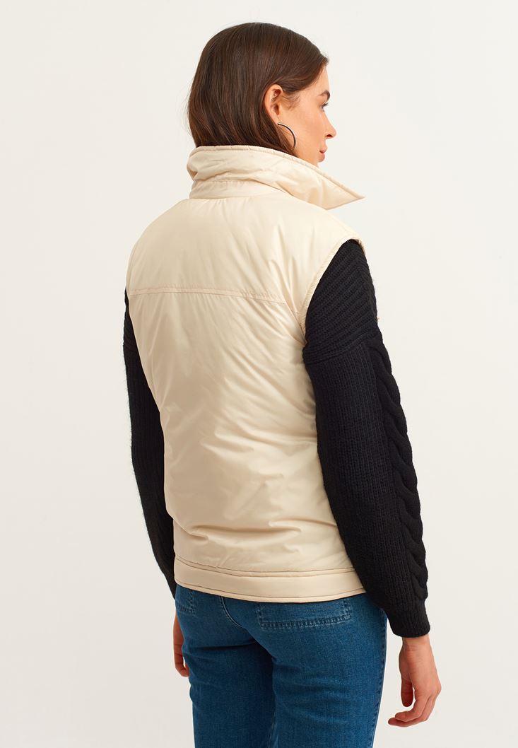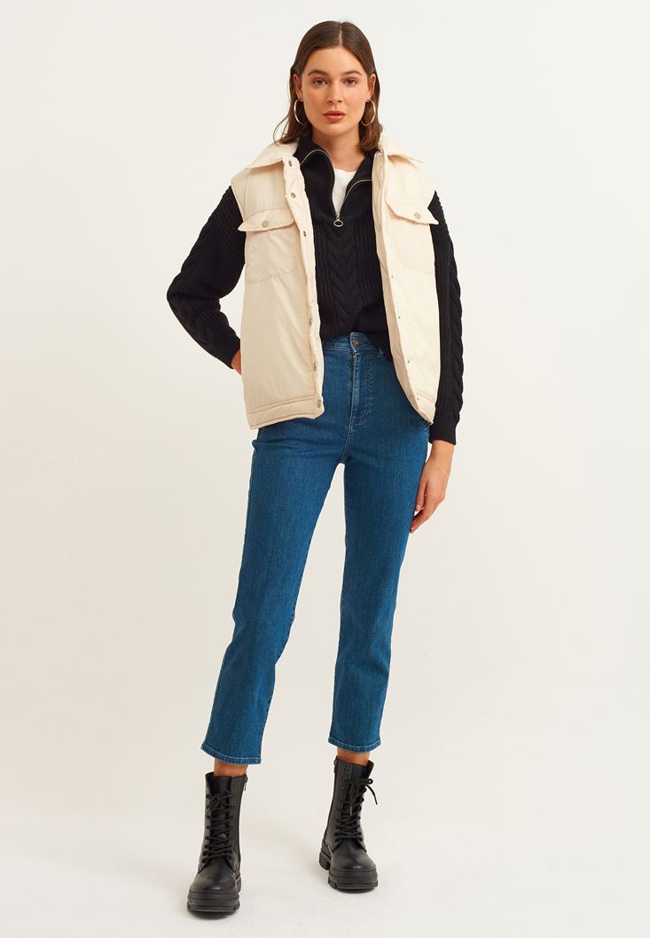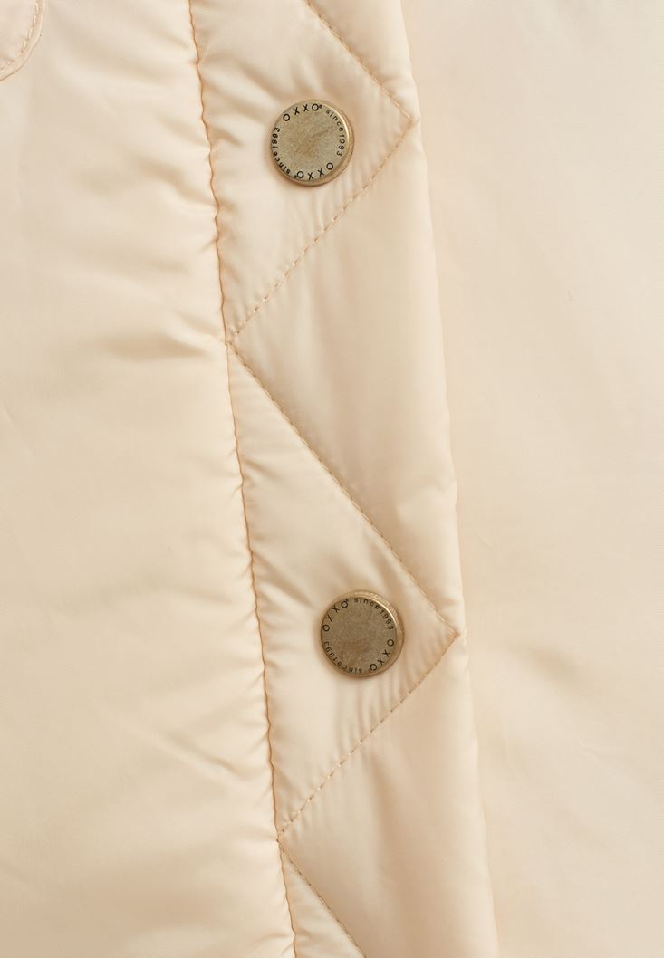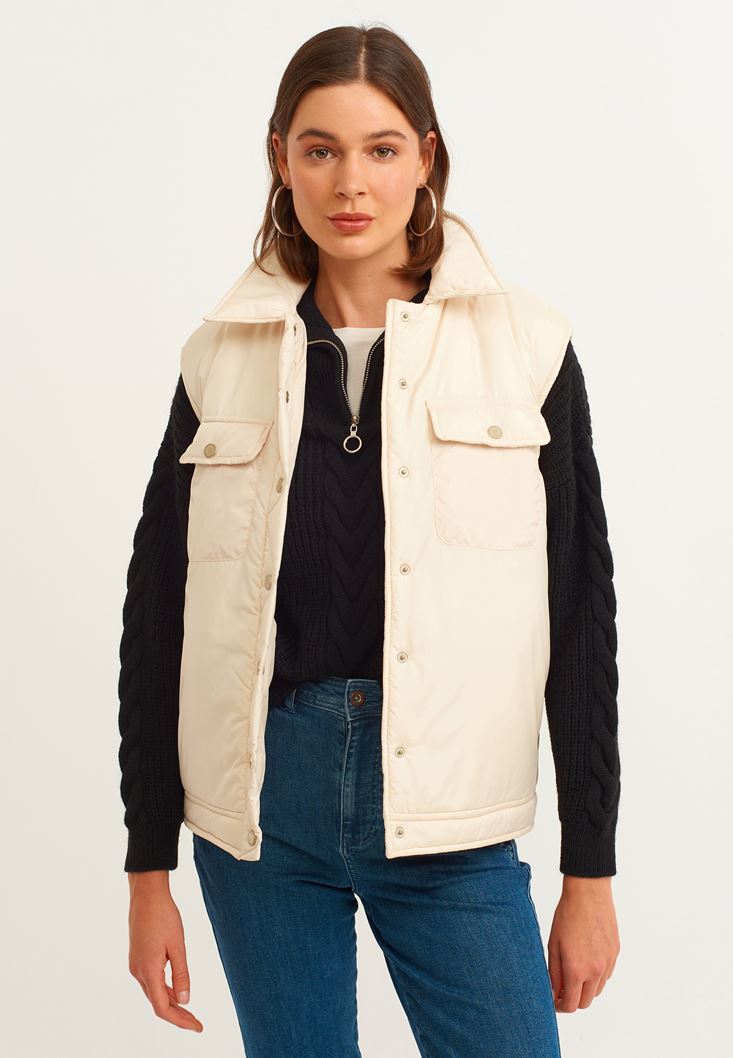 Dolgulu puf doku, üst kısmında iki kapaklı cep, çıtçıt kapamalı,  oversize-fit, standart boy, alt kısmı iki cepli.