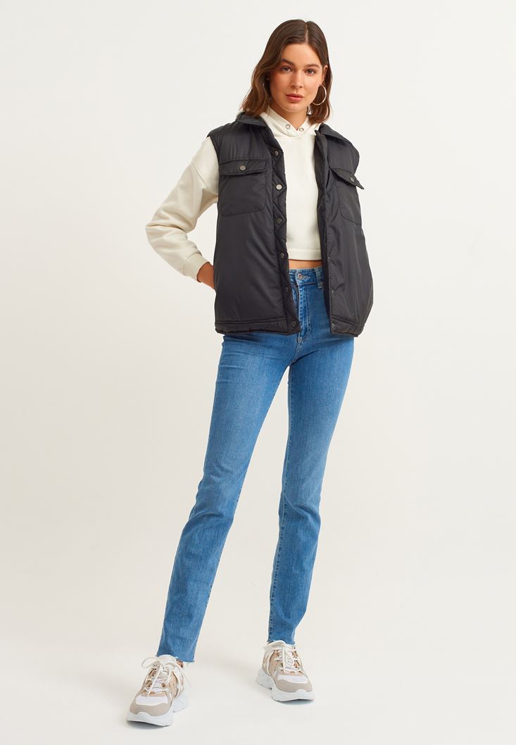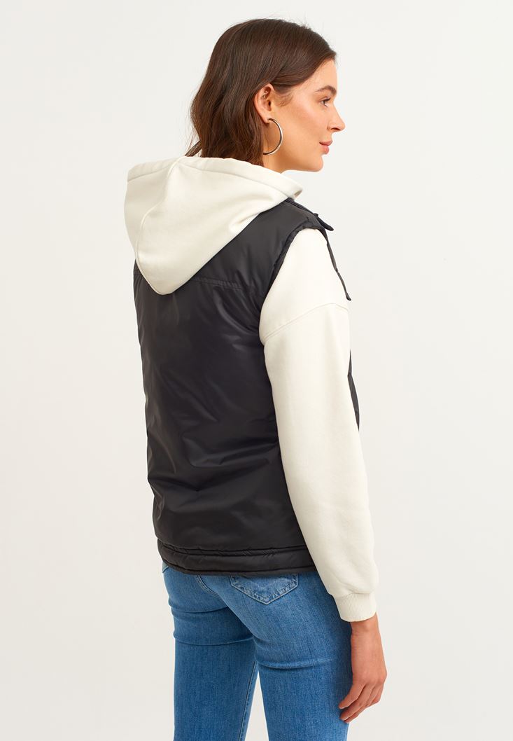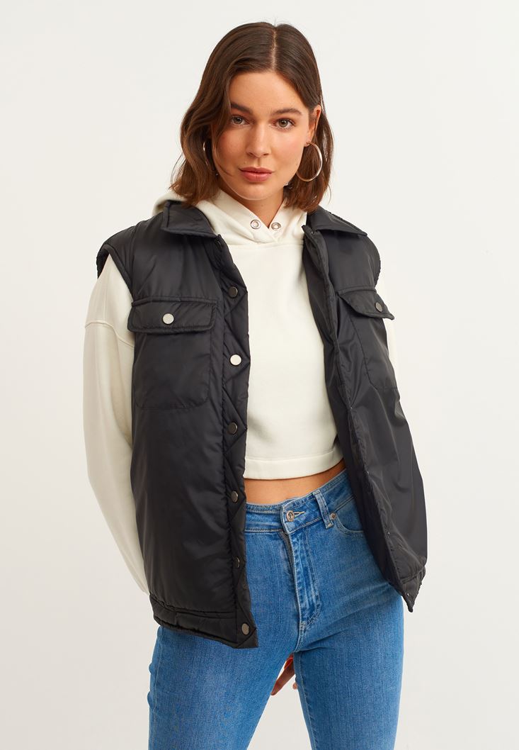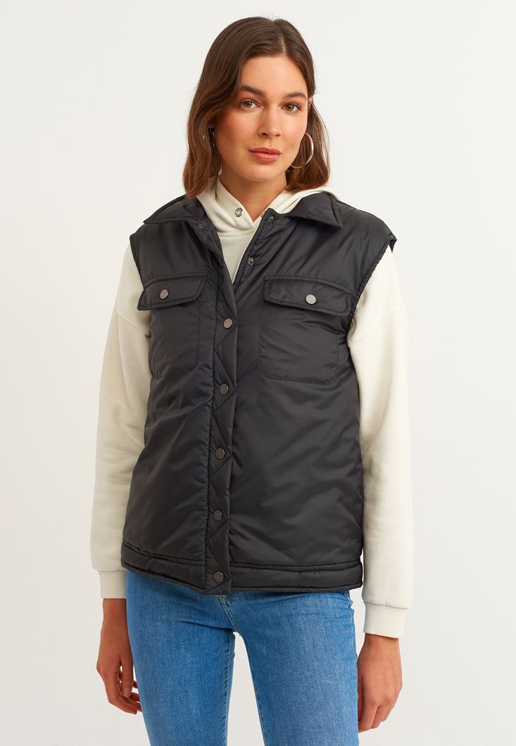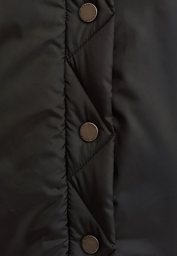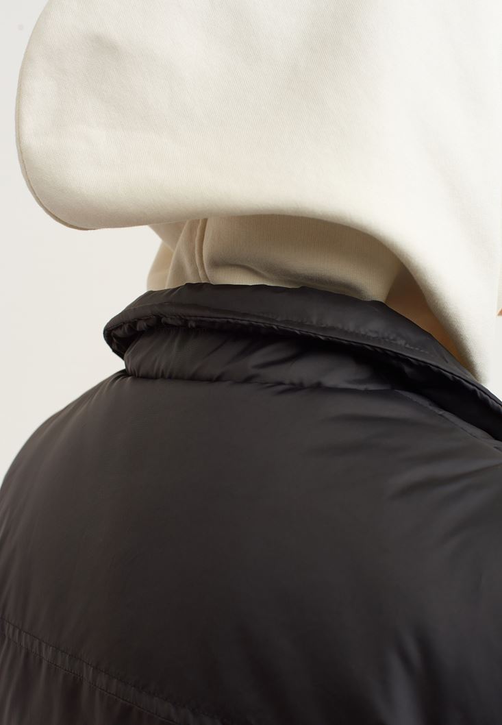 Dolgulu puf doku, üst kısmında iki kapaklı cep, çıtçıt kapamalı,  oversize-fit, standart boy, alt kısmı iki cepli.