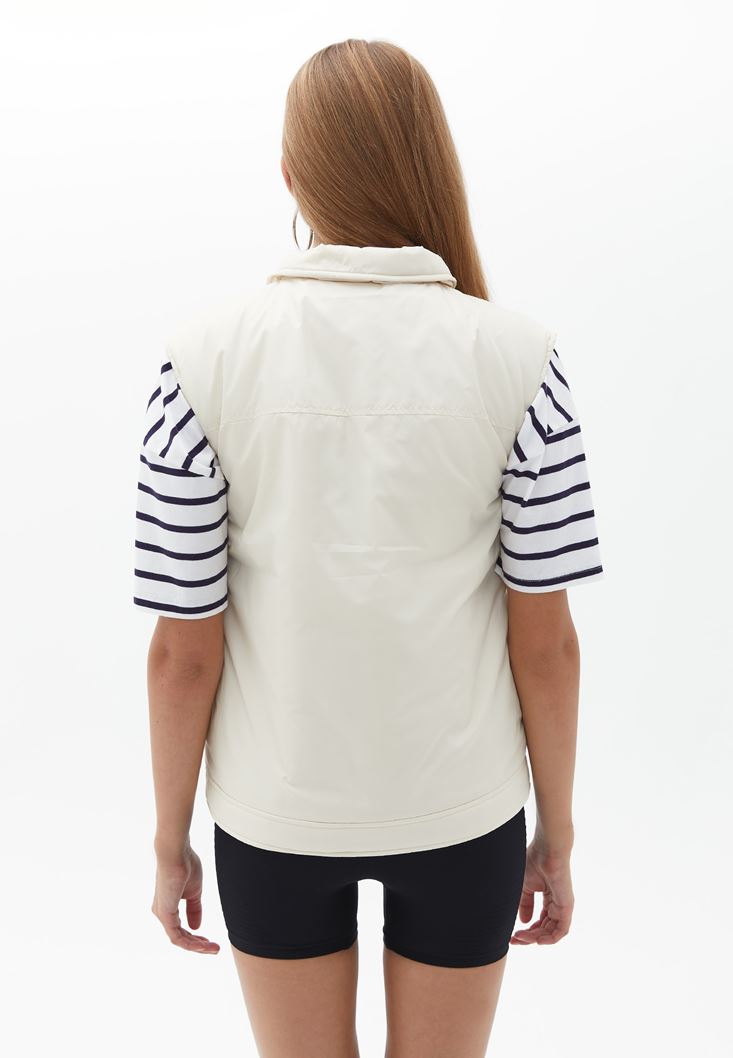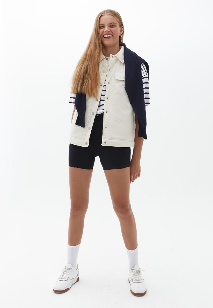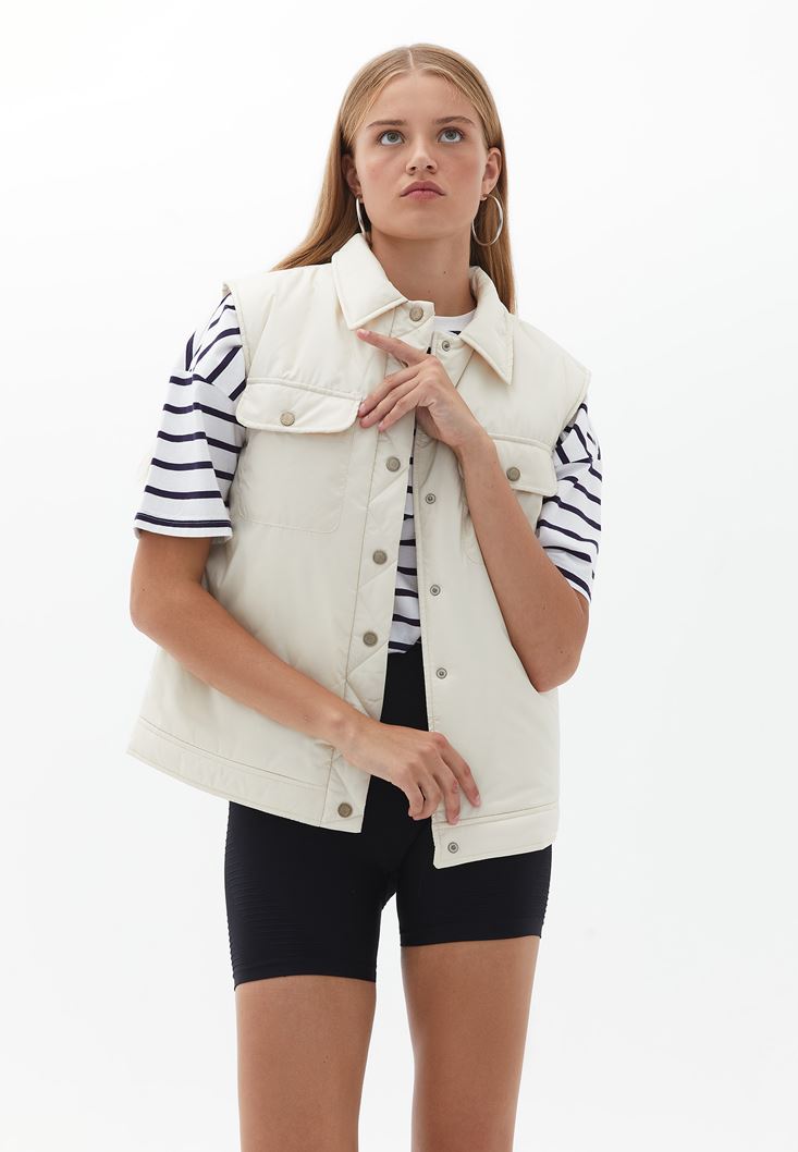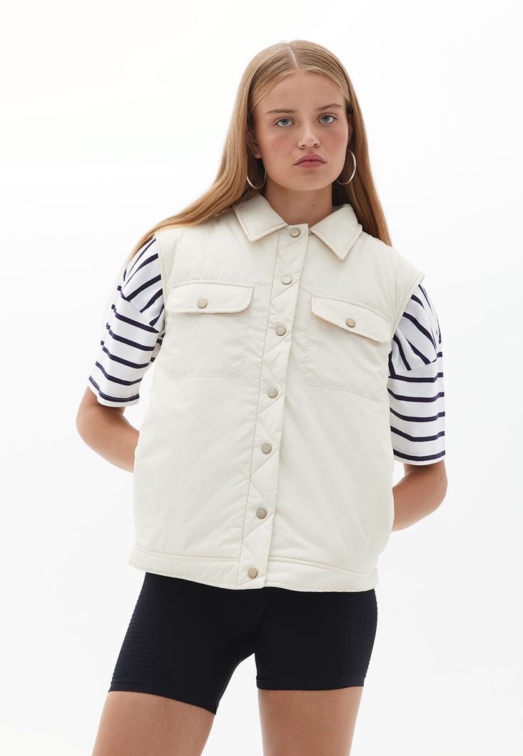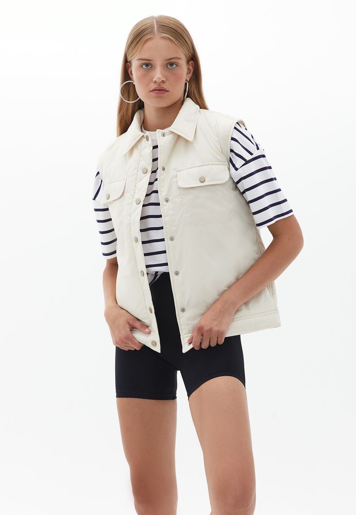Dolgulu puf doku, üst kısmında iki kapaklı cep, çıtçıt kapamalı,  oversize-fit, standart boy, alt kısmı iki cepli.